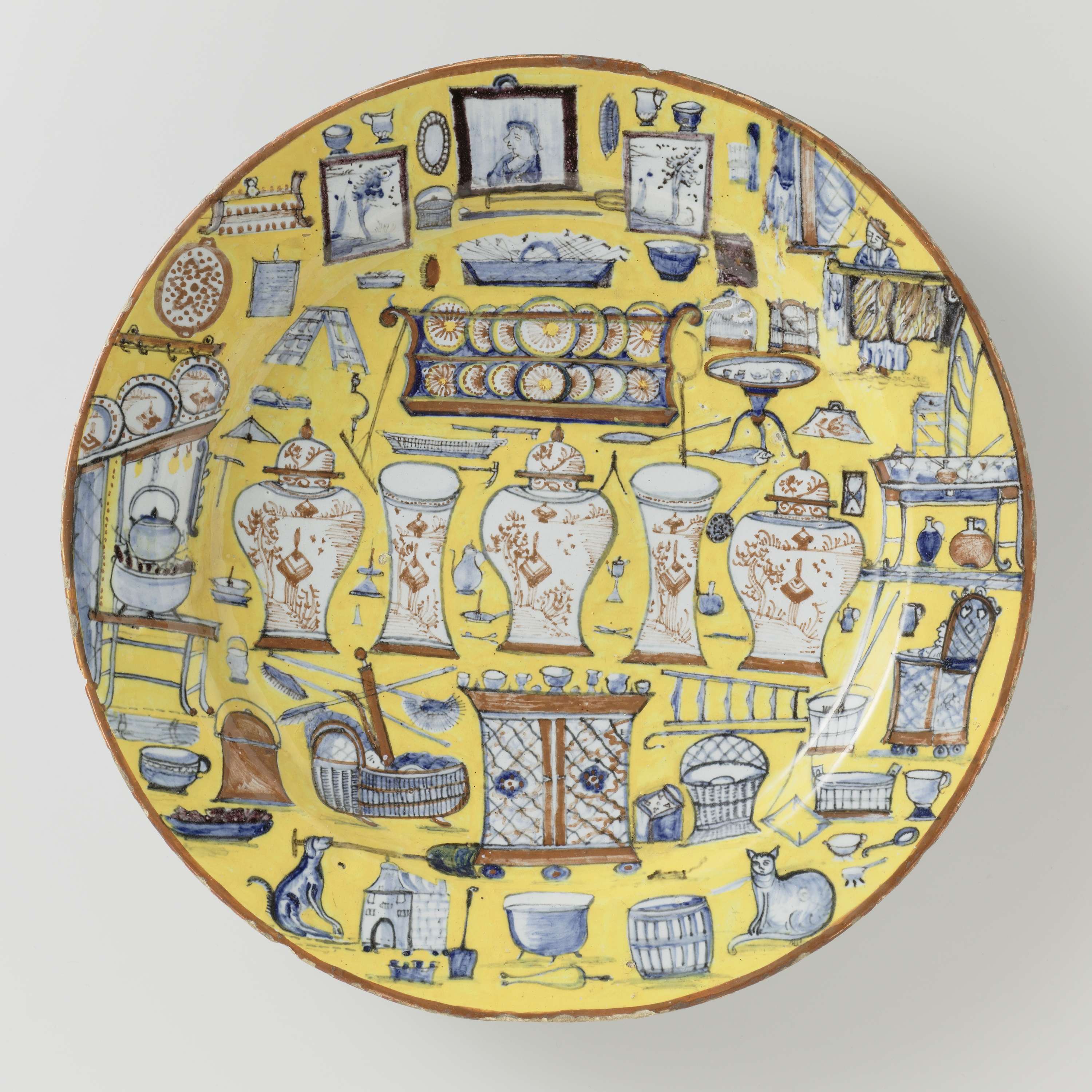 | Nederlands | Schotel, op geel fond veelkleurig beschilderd met huisraad |
