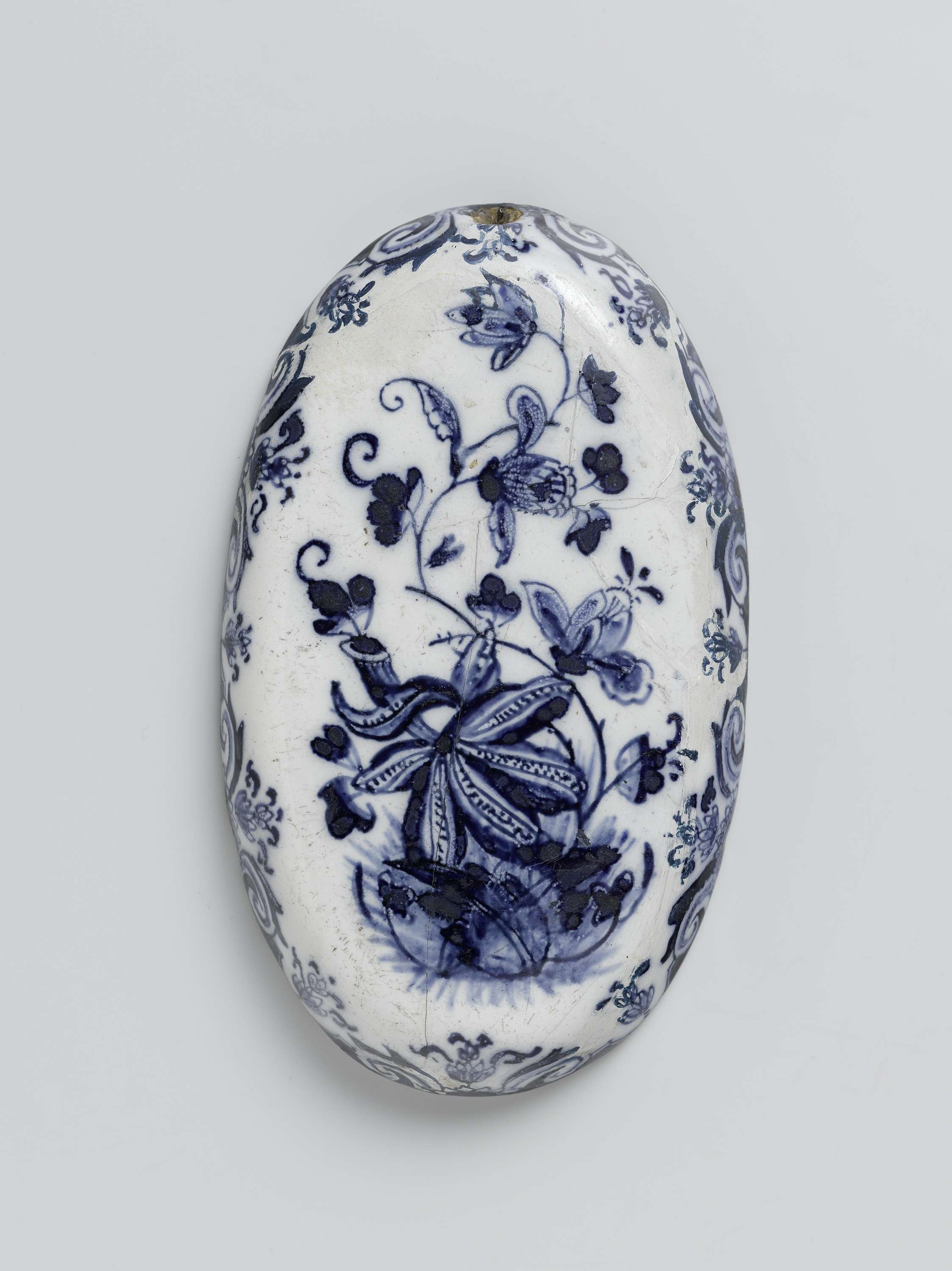 Ovale borstelrug van blauw beschilderde faïence, beschilderd met bladeren en bloemenranken en langs de rand een bloemmotief. De borstelrug is sinds 1958 in bruikleen afgestaan aan J.H. Loudon (Aerdenhout) en iin maart 1996 geretourneerd. (Nederlands)