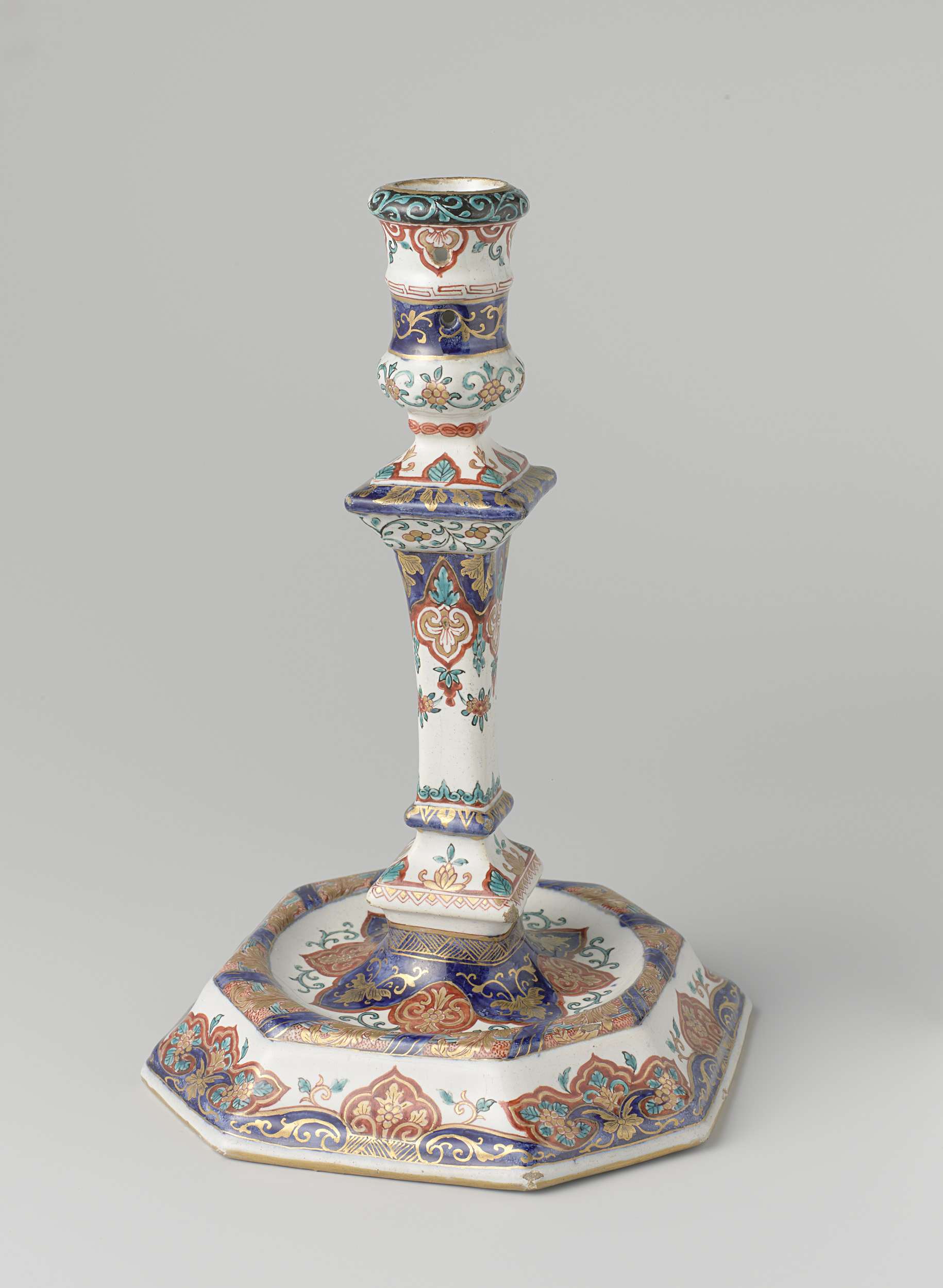 Kandelaar van faience, veelkleurig beschilderd, met vierkante schacht en ronde kaarsenhouder op achtkantige voet. Versieringen in rood, blauw, groen zwart en goud op witte grond. (Nederlands)