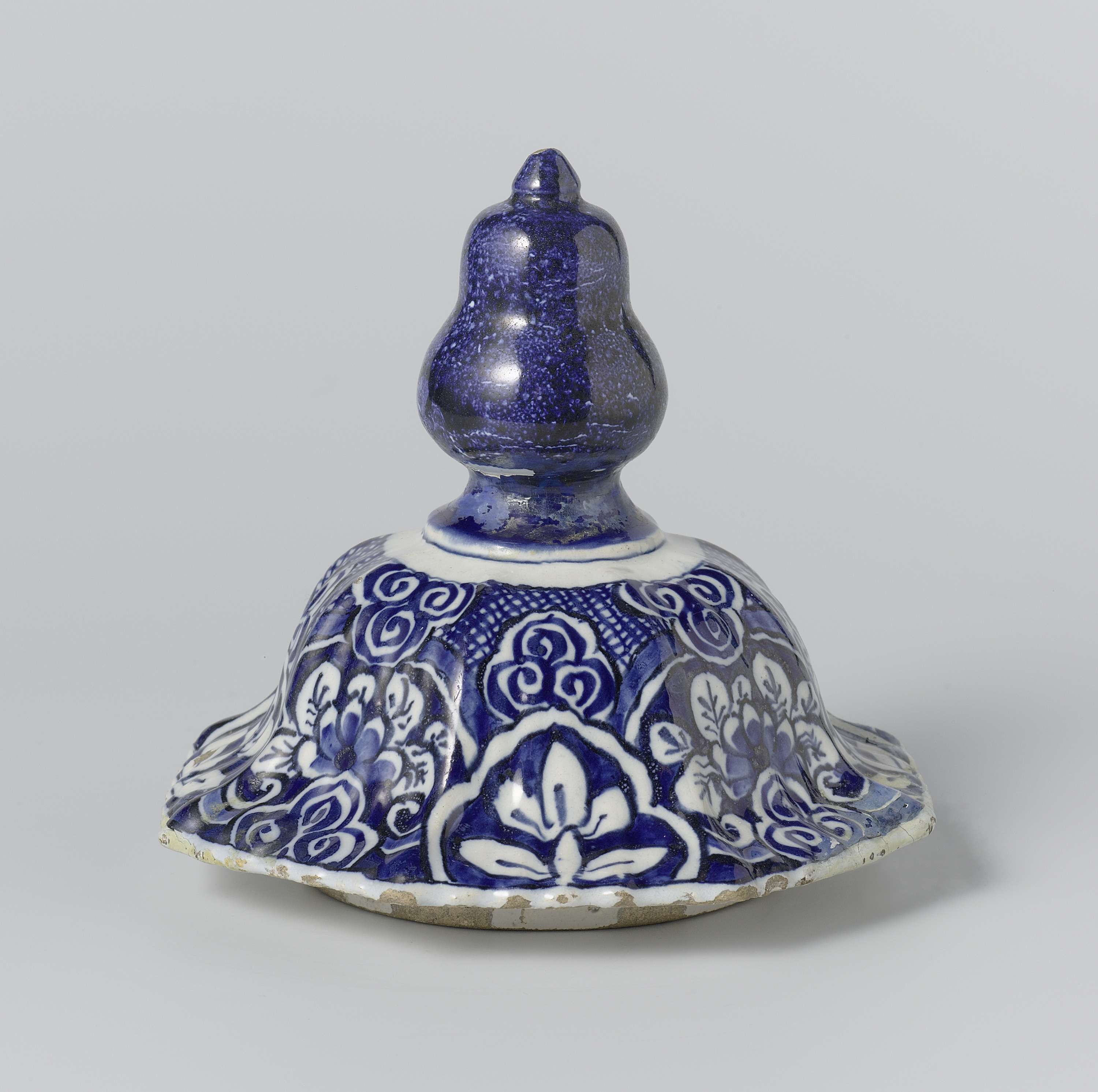 Deksel, achthoekig gewelfd, met knop en met blauw-witte decoratie met bladeren en bloemen (Nederlands)