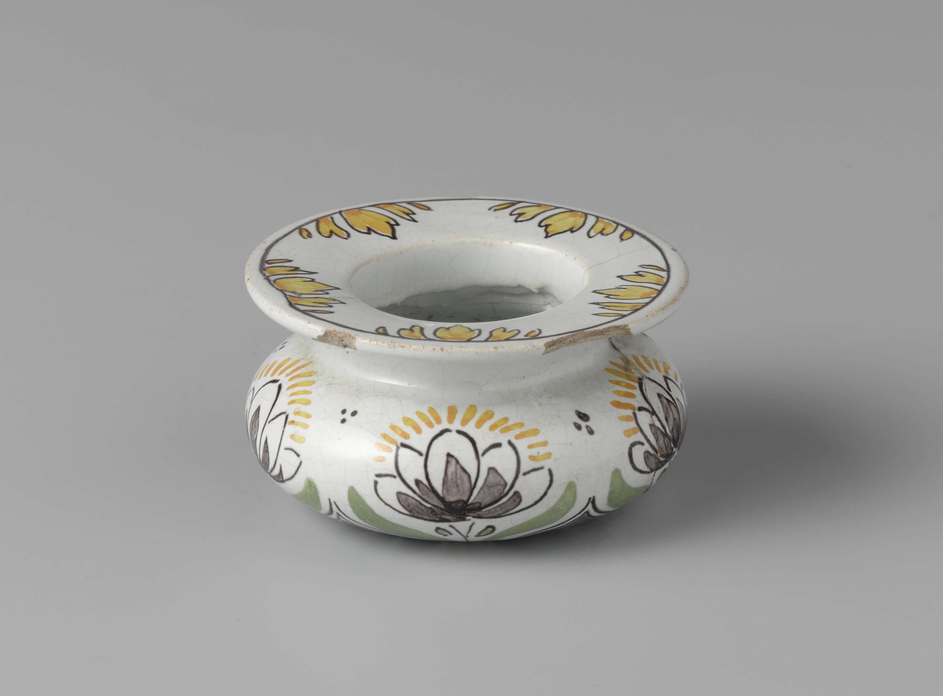 Vaas van aardewerk, met bol lichaam en kort ingesnoerde hals en wijd uitstaande mondrand. Gedecoreerd met gestileerde bloemen en bladwerk in de kleuren blauw, groen, zwart en geel. (Nederlands)