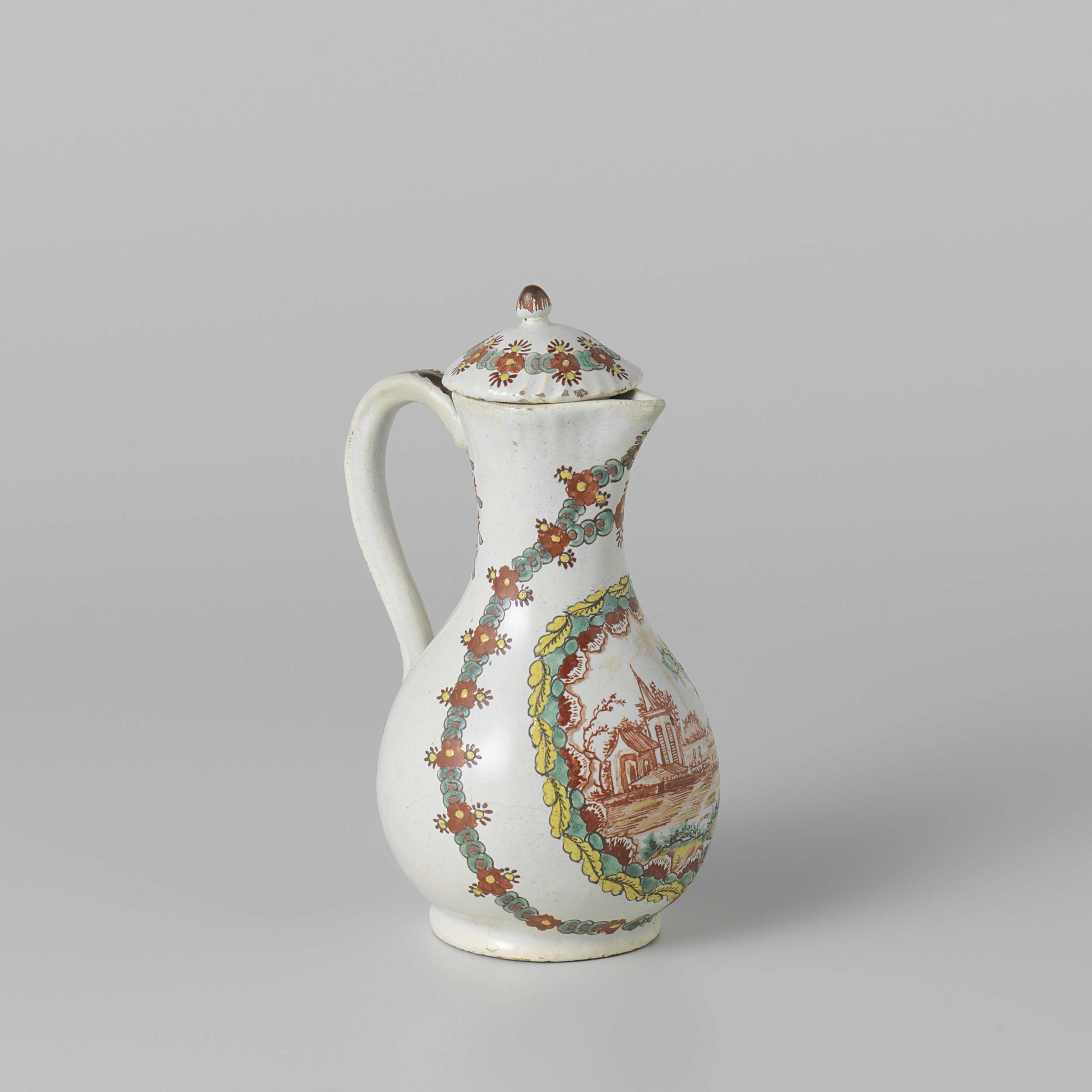 Melkkan met deksel van veelkleurig beschilderde faïence met een decor van een landschap binnen een krans. (Nederlands)