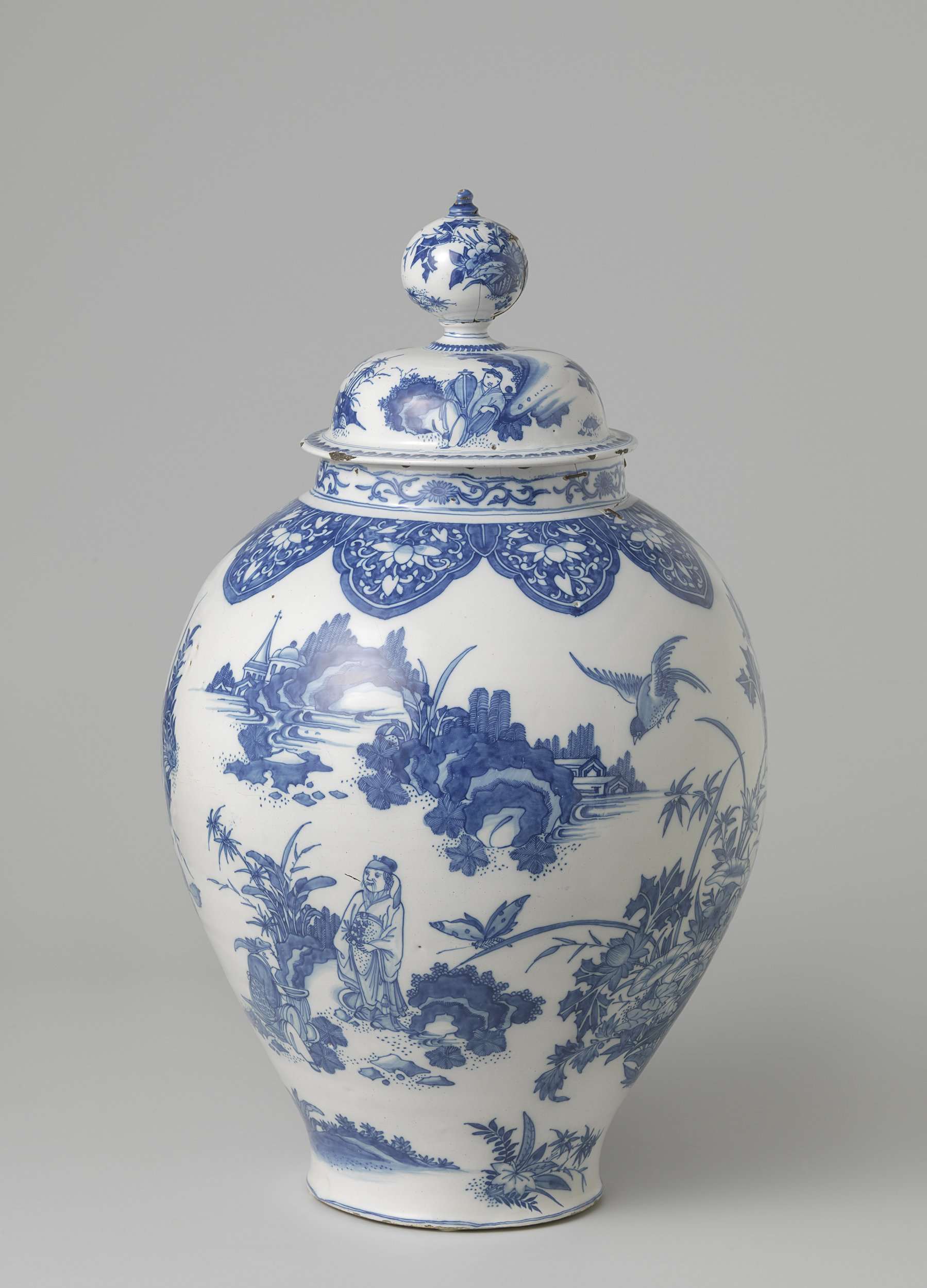 Pot met deksel, beschilderd in blauw op witte fond met groepen Chinezen, een vliegende phoenix en grote bloemboeketten, die allemaal apart, zonder verband en niet geschieden door cartouches als decoratieve elementen over het bolle vlak zijn gestrooid. Alles in Chinese stijl ontleend aan decoraties op Chinees porselein, maar stukjes eruit en een eigen interpretatie c.q. verwerking: Chinoiserie. (Nederlands)