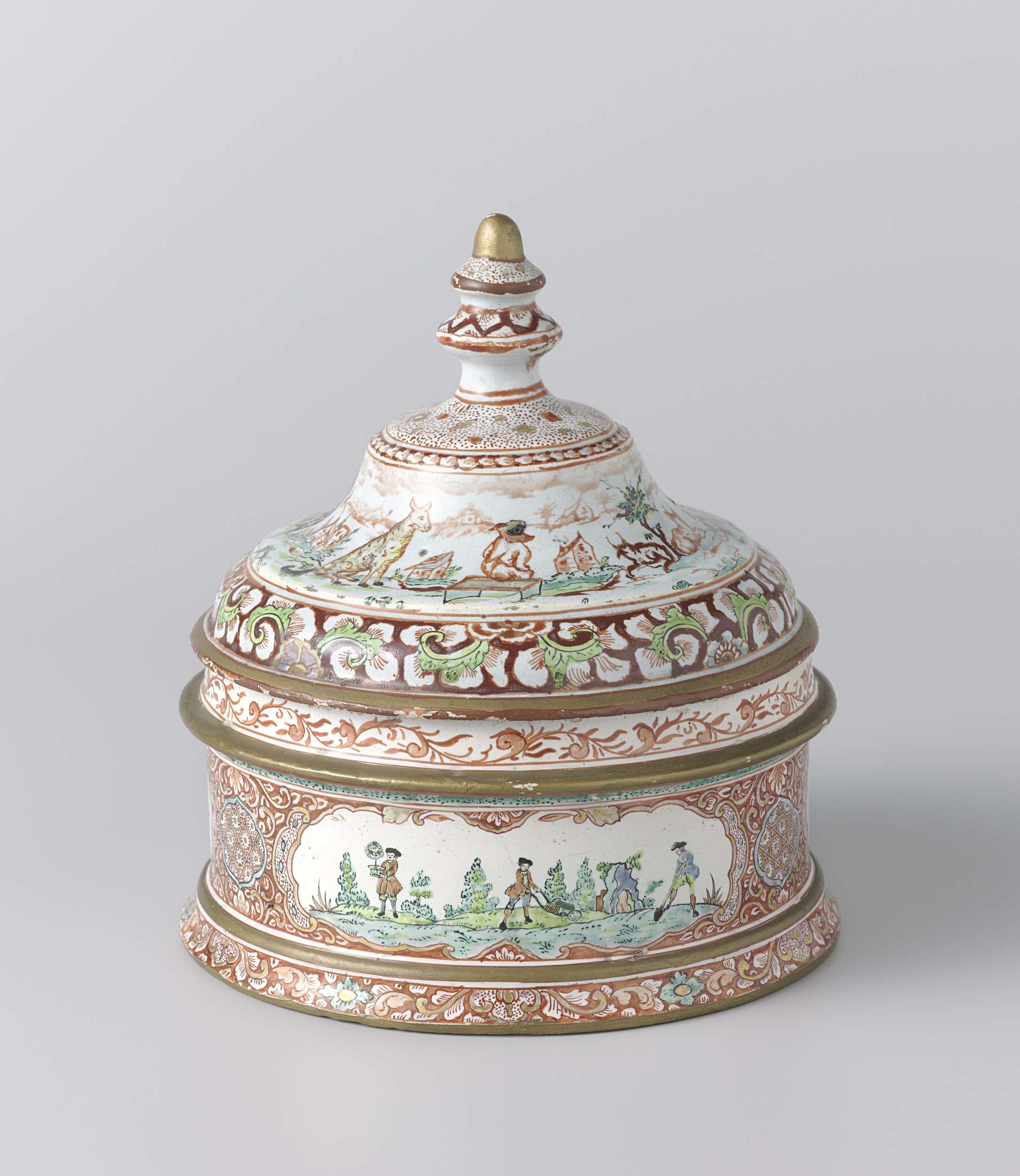 Deksel van faïence, veelkleurig beschilderd met een landschap met dieren. Het deksel is geschonken tezamen met een tabakspot (B). Het deksel en de pot horen oorspronkelijk niet bij elkaar. (Nederlands)