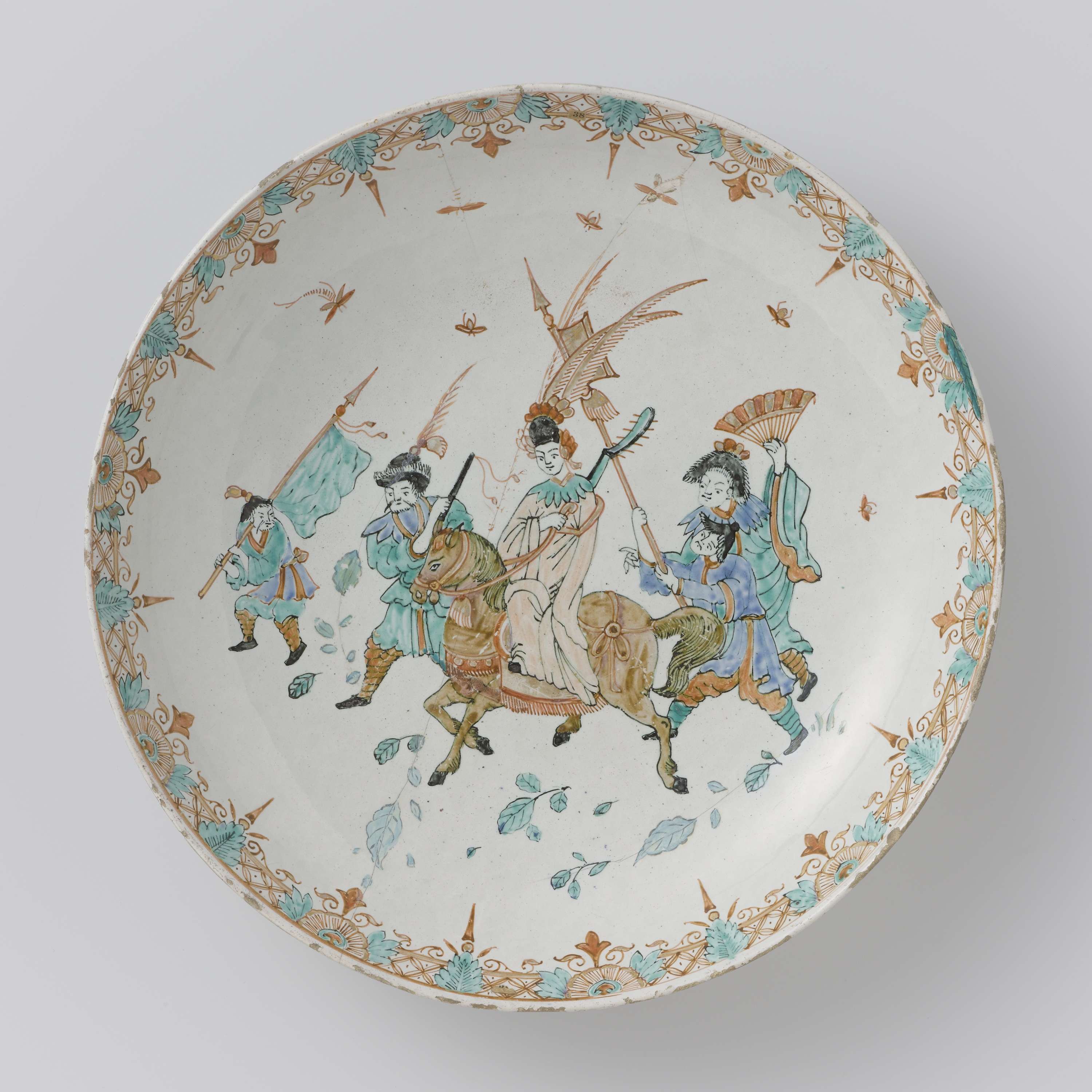 Schotel veelkleurig beschilderd in imitatie famille verte met Oosterse figuren waaronder een prinses te paard. (Nederlands)