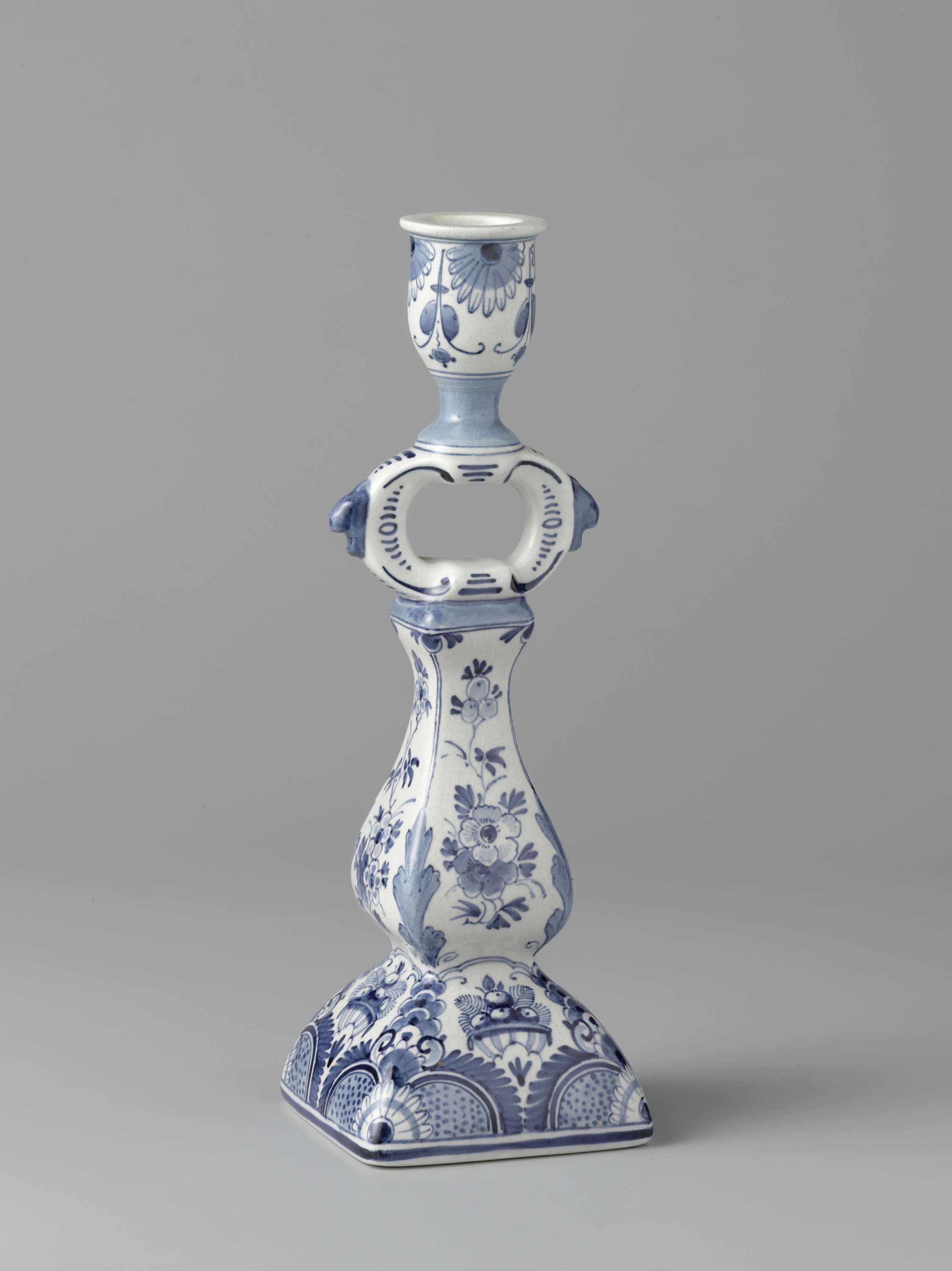 Kandelaar van aardewerk. Blauwwitte decoratie met fruitmanden en bloemen. Vierkante gewelfde voet met balustervormige stam met opengewerkte nodus, gevormd door twee C-voluten. Hierop de kaarsenhouder. (Nederlands)
