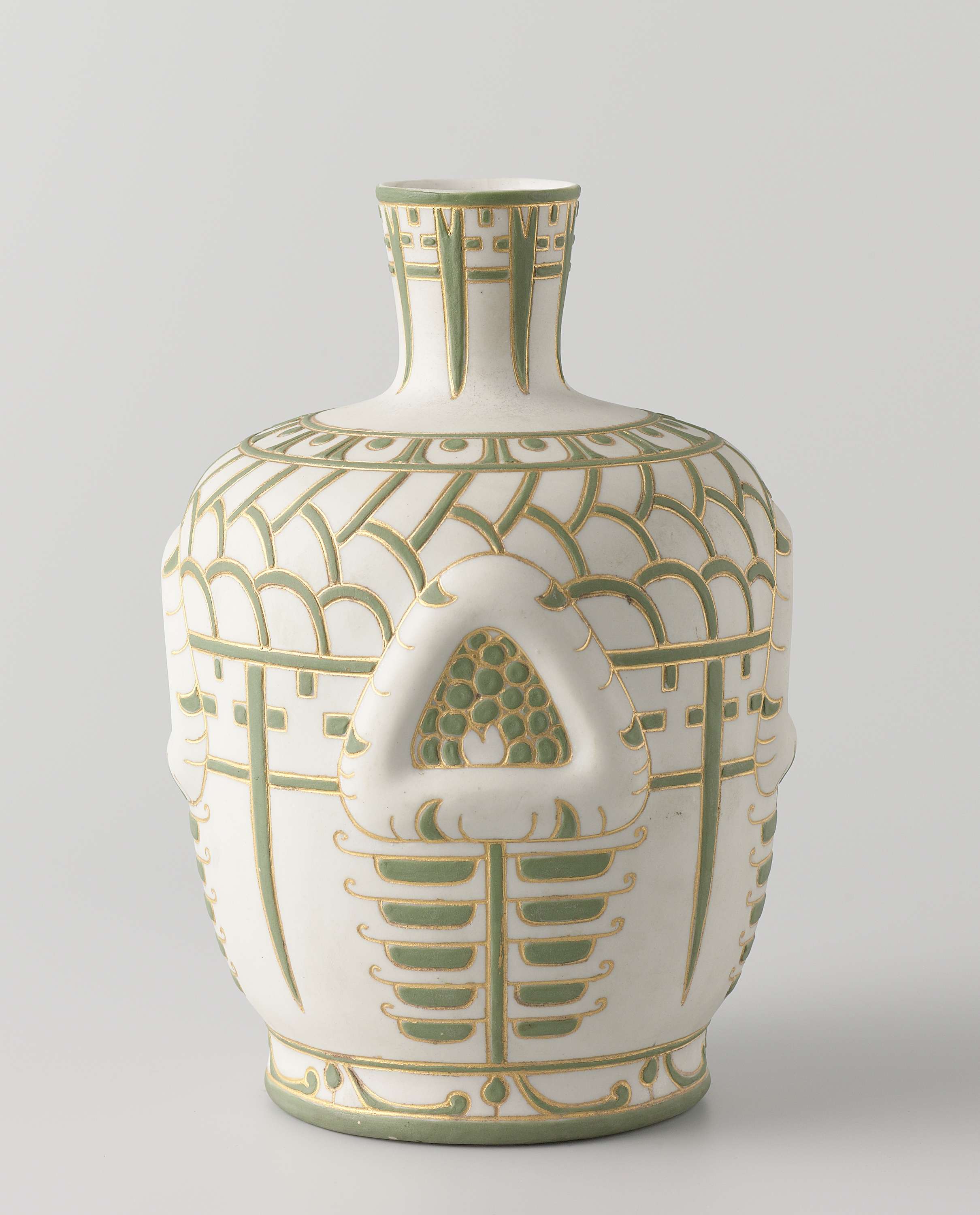 Vaas van biscuit porselein, versierd in groen en goud. Op de wand vier maal een driehoek in reliëf. Ook de ornamentale versiering in groen is in reliëf. Nauwe korte hals. Binnenkant geglazuurd. (Nederlands)