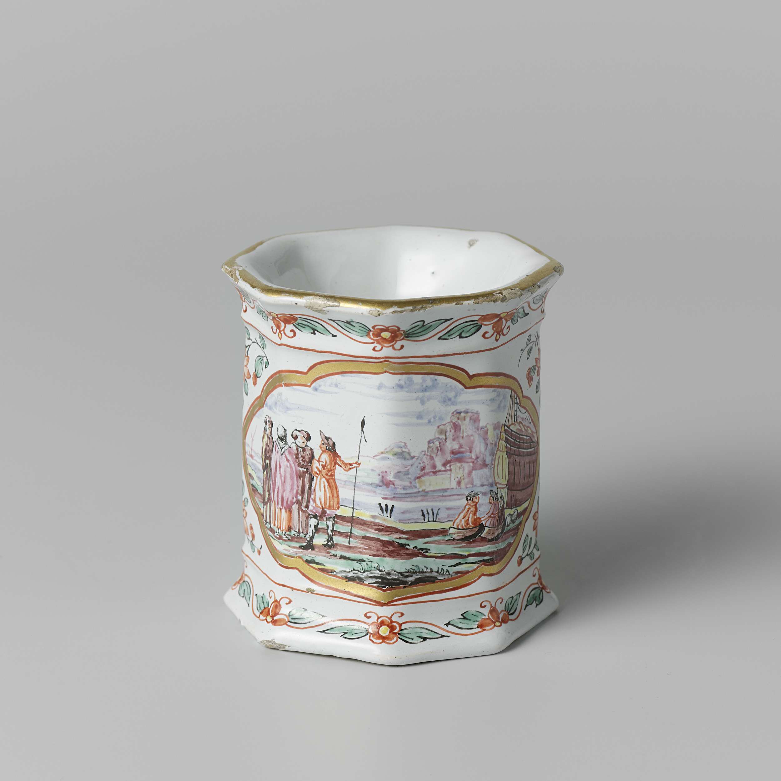 Achthoekig zoutvat, veelkleurig beschilderd met een mediterraans landschap in een cartouche. (Nederlands)