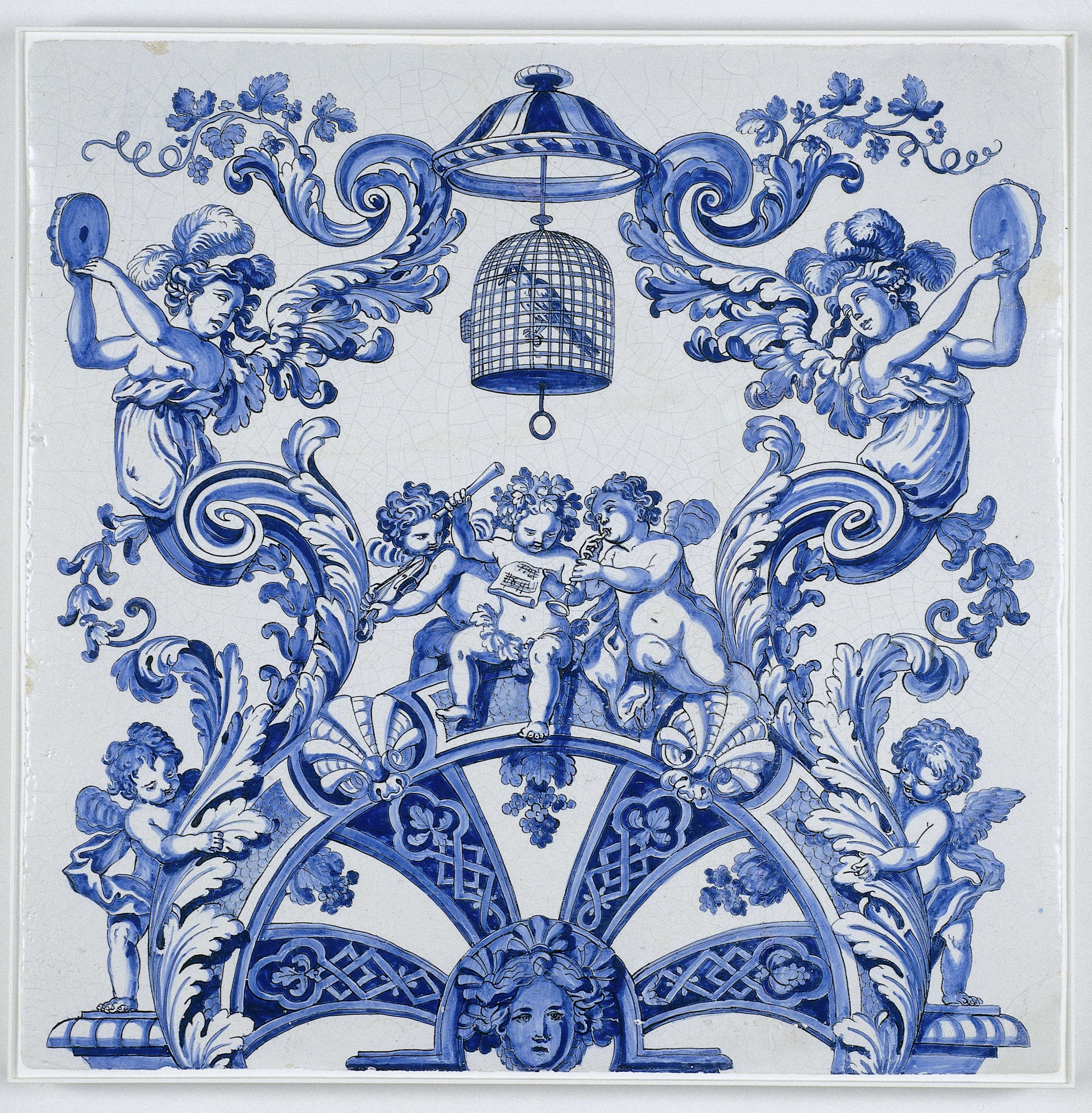 Tegel met een blauwe voorstelling met drie musicerende engeltjes zittend op een halfronde boog. Binnen het halfrond vier radiaal geplaatste naar het centrum verjongende banden versierd met Bérain-bandwerk welke samen komen in het hart van de cirkel, dat gevormd wordt door een vrouwenkopje met palmetten in het haar. Tussen de banden hangen druiventrossen. (Nederlands)
