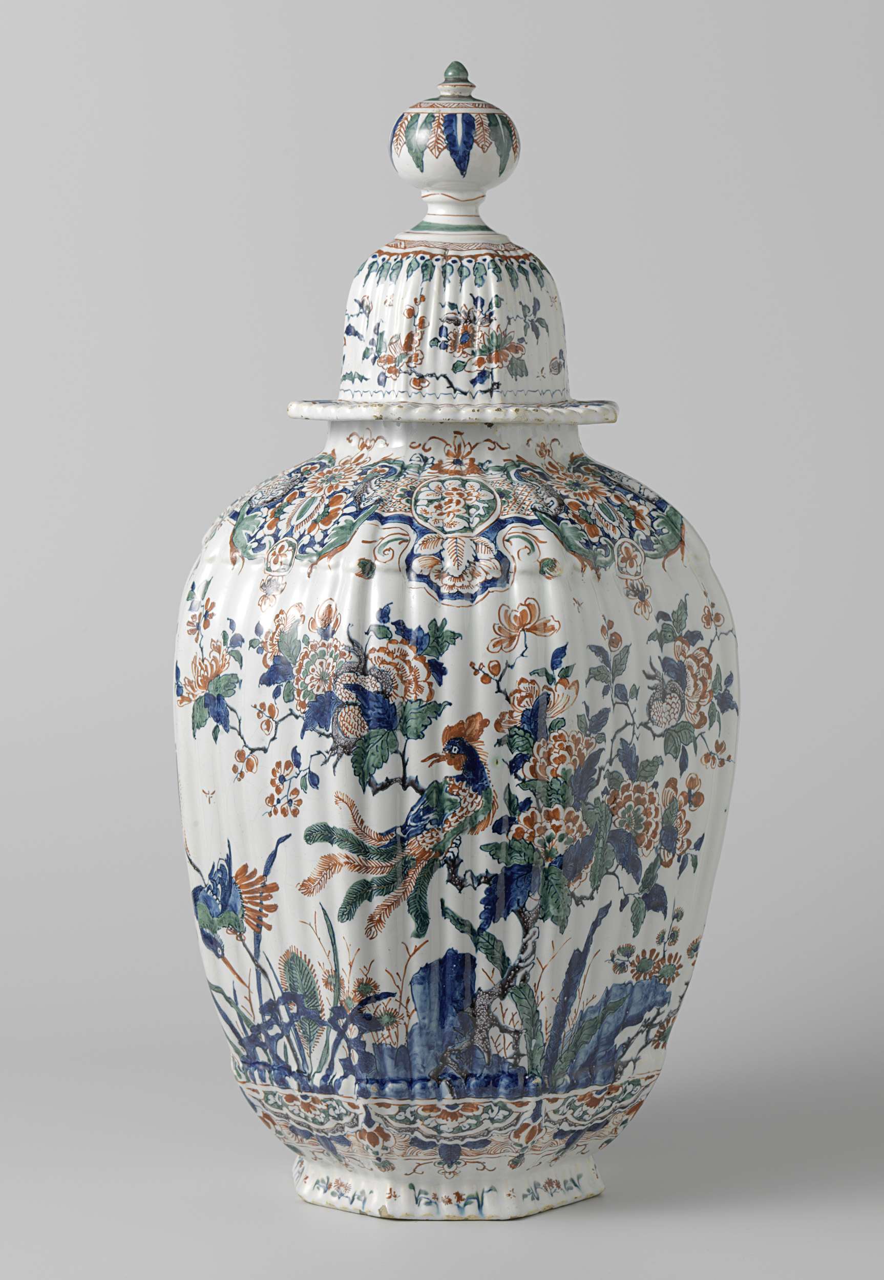 | Nederlands | Achtkantige geribde vaas met deksel van veelkleurig beschilderde faïence |