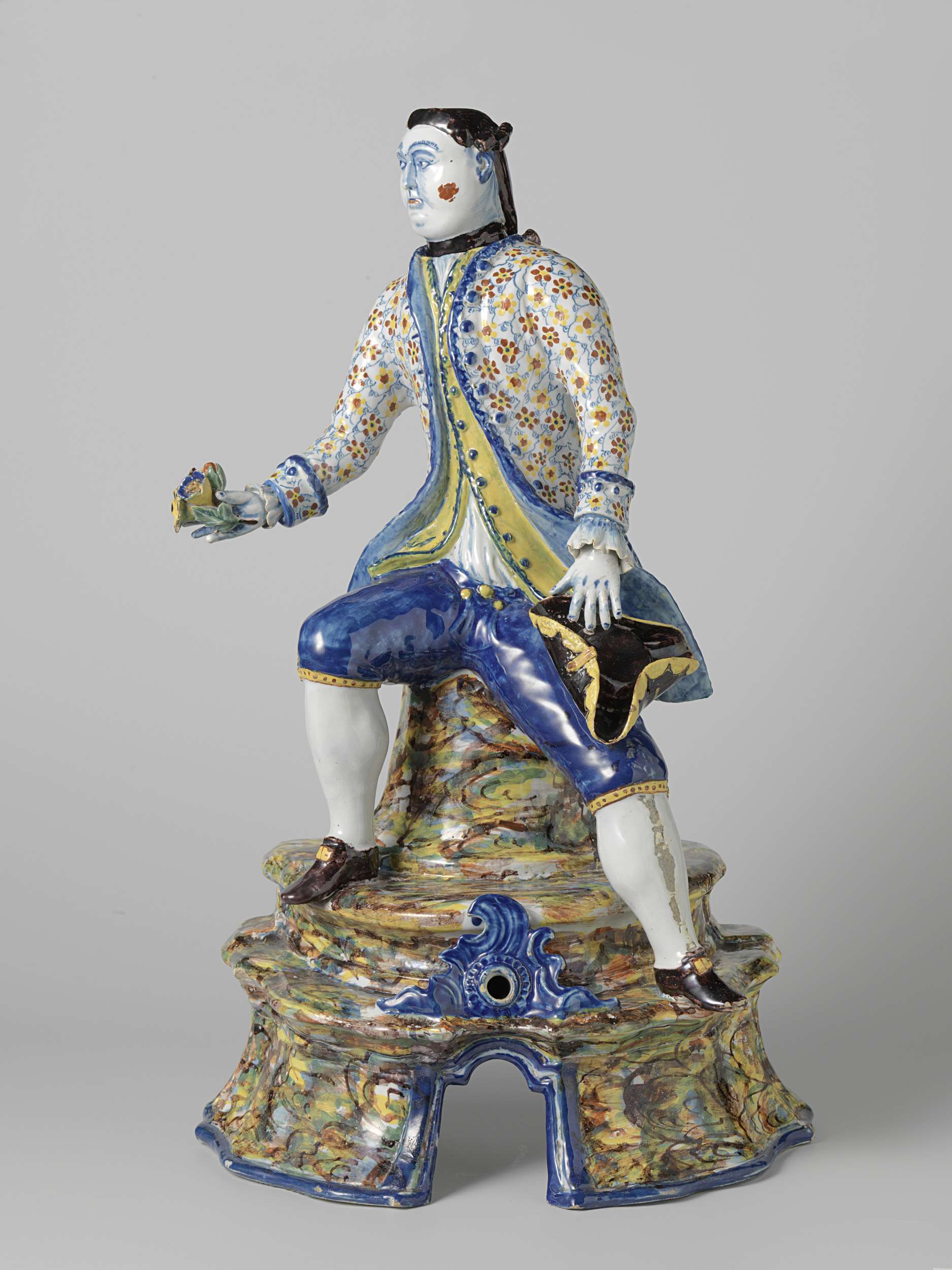 Fontein van veelkleurig beschilderde faïence. De fontein heeft de vorm van een man, zittend op een geprofileerd voetstuk. (Nederlands)