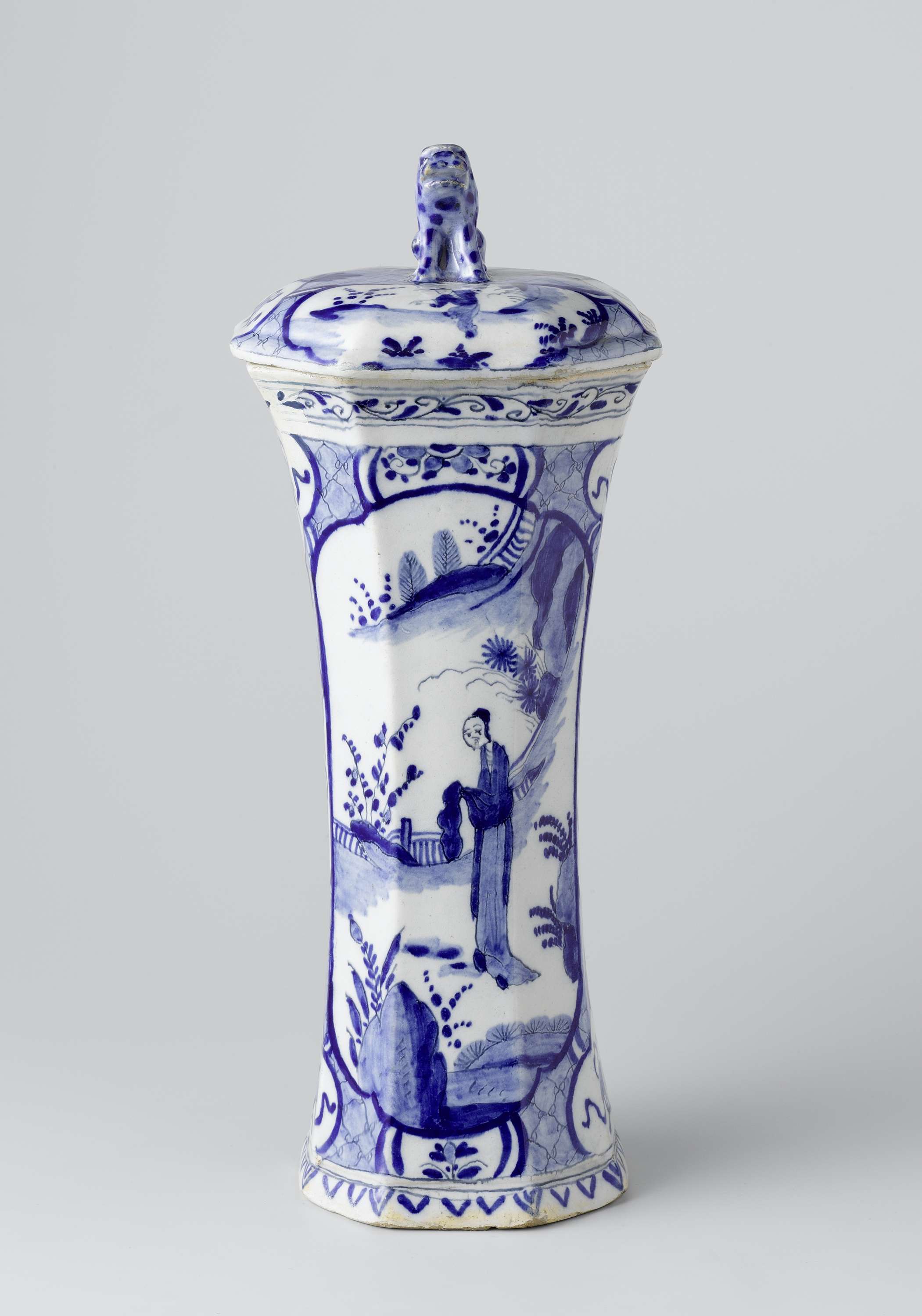 Vaas met deksel, achtkantig, van faïence, in blauw beschilderd. De knop van het deksel is een zittende leeuw. Op de pot zijn twee medaillons geschilderd waarbinnen een landschap met een Chinese figuur. De pot is onderdeel van een kaststel, de andere delen zijn: twee potten die gelijk zijn aan bovengenoemde pot en twee identieke vazen. De delen zijn gemerkt. (Nederlands)