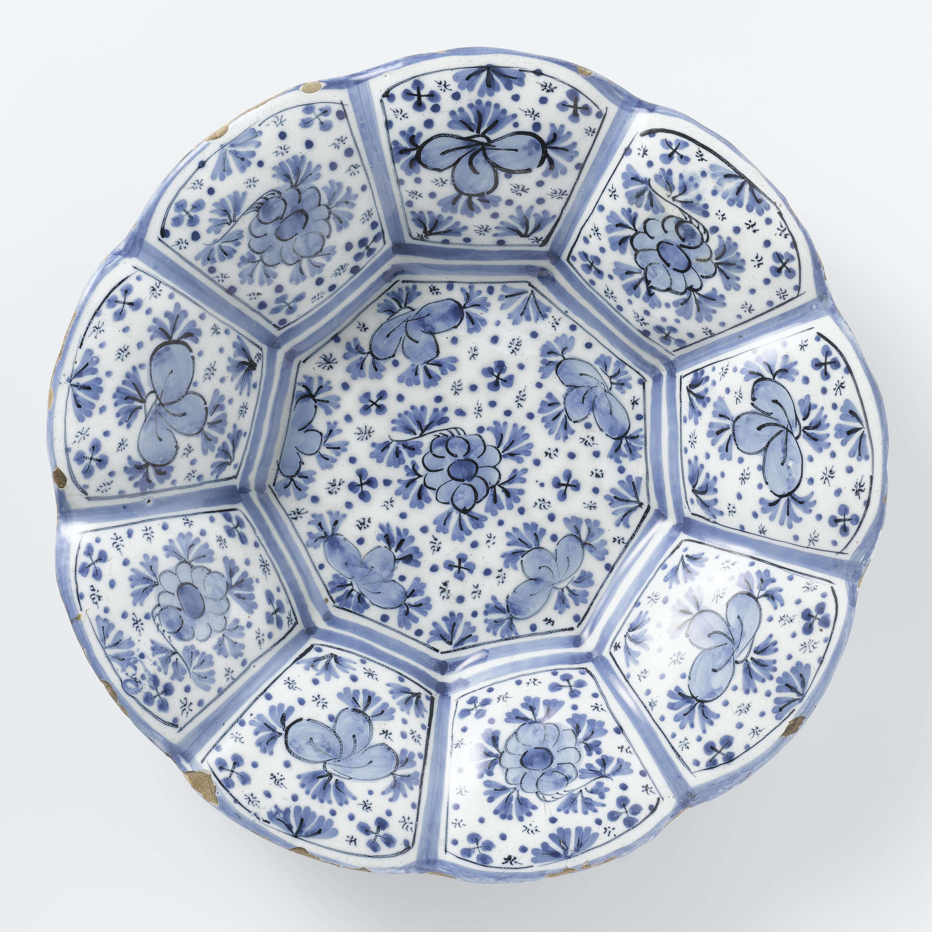 Schotel met negenlobbige rand van blauw beschilderde faience (Q28190)