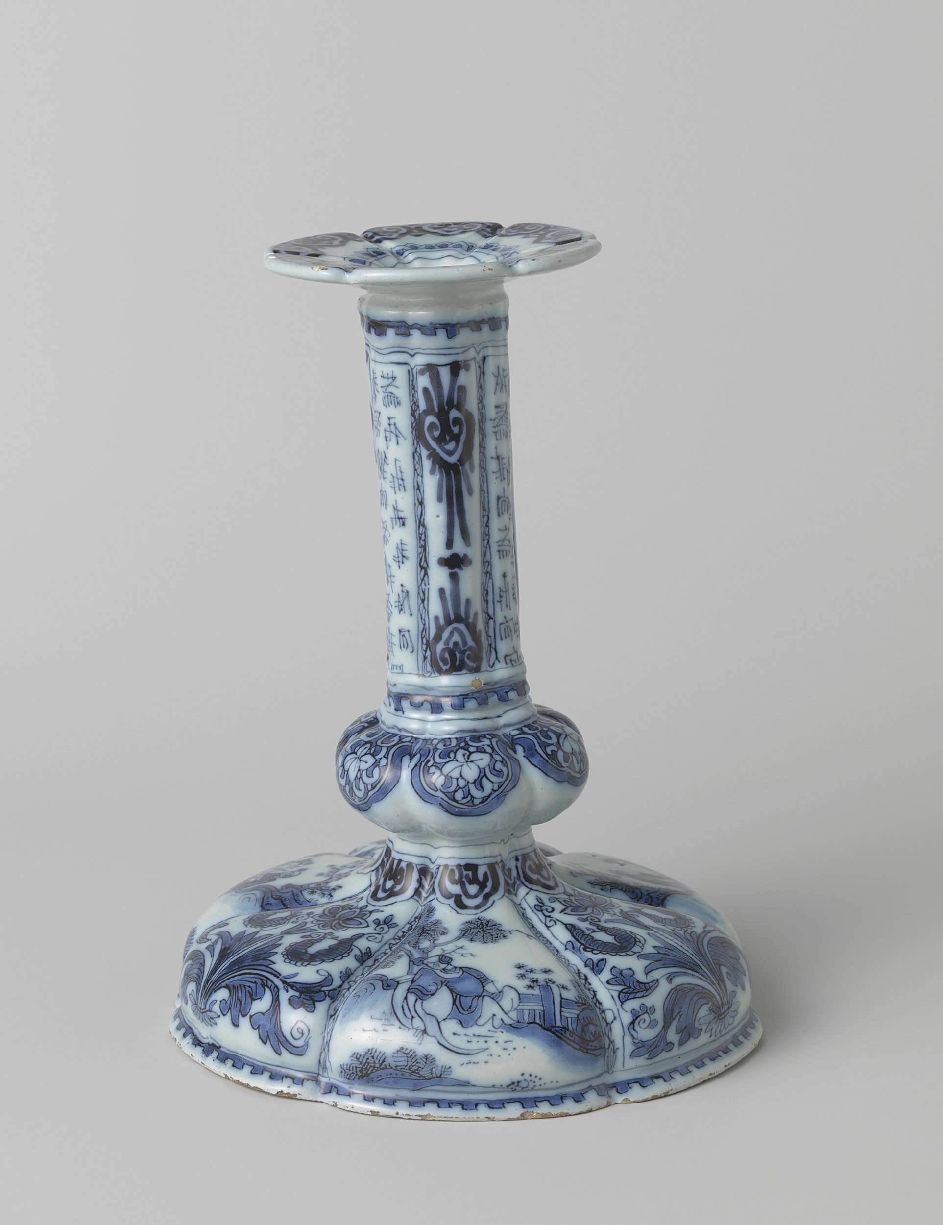 Kandelaar van faience met een chinoiserie decoratie geïnspireerd op het Chinese overgangs porselein en met pseudo Chinese karakters. (Nederlands)