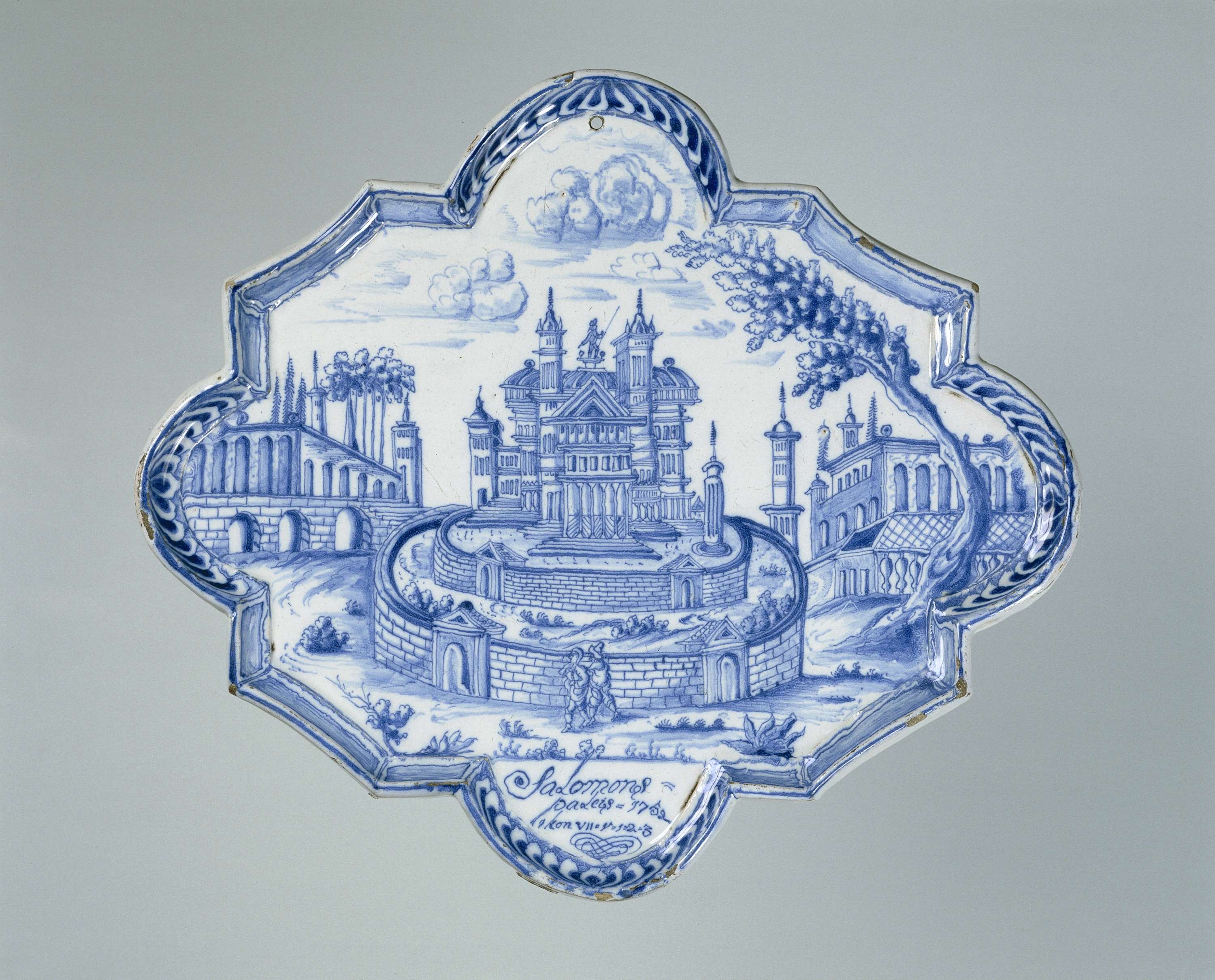 Opschrift: onderaan plaat, geschilderd in blauw, Salomons/ paleis = 1752/ 1 kon VII = V = 1 = 2 = 3. (Nederlands)
