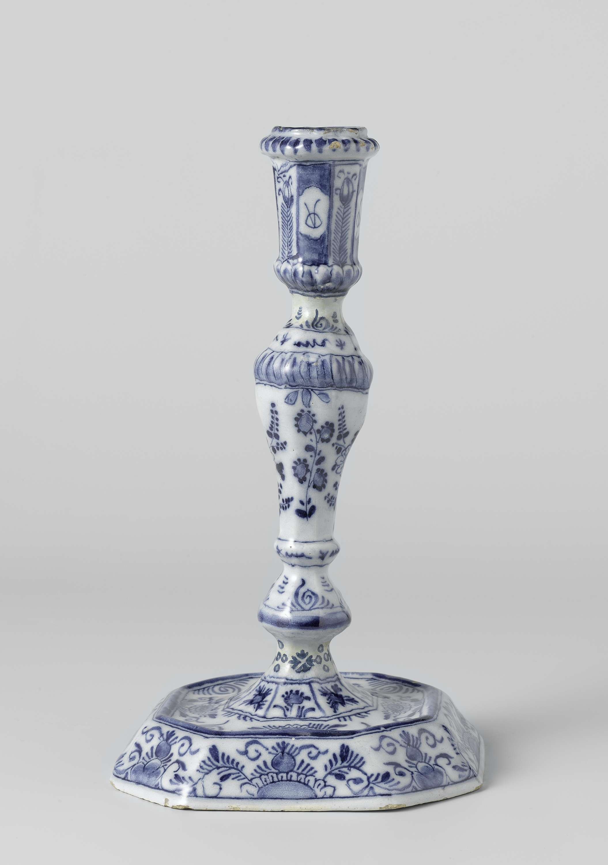 Kandelaar van faience, blauw beschilderd in de glazuur. (Nederlands)