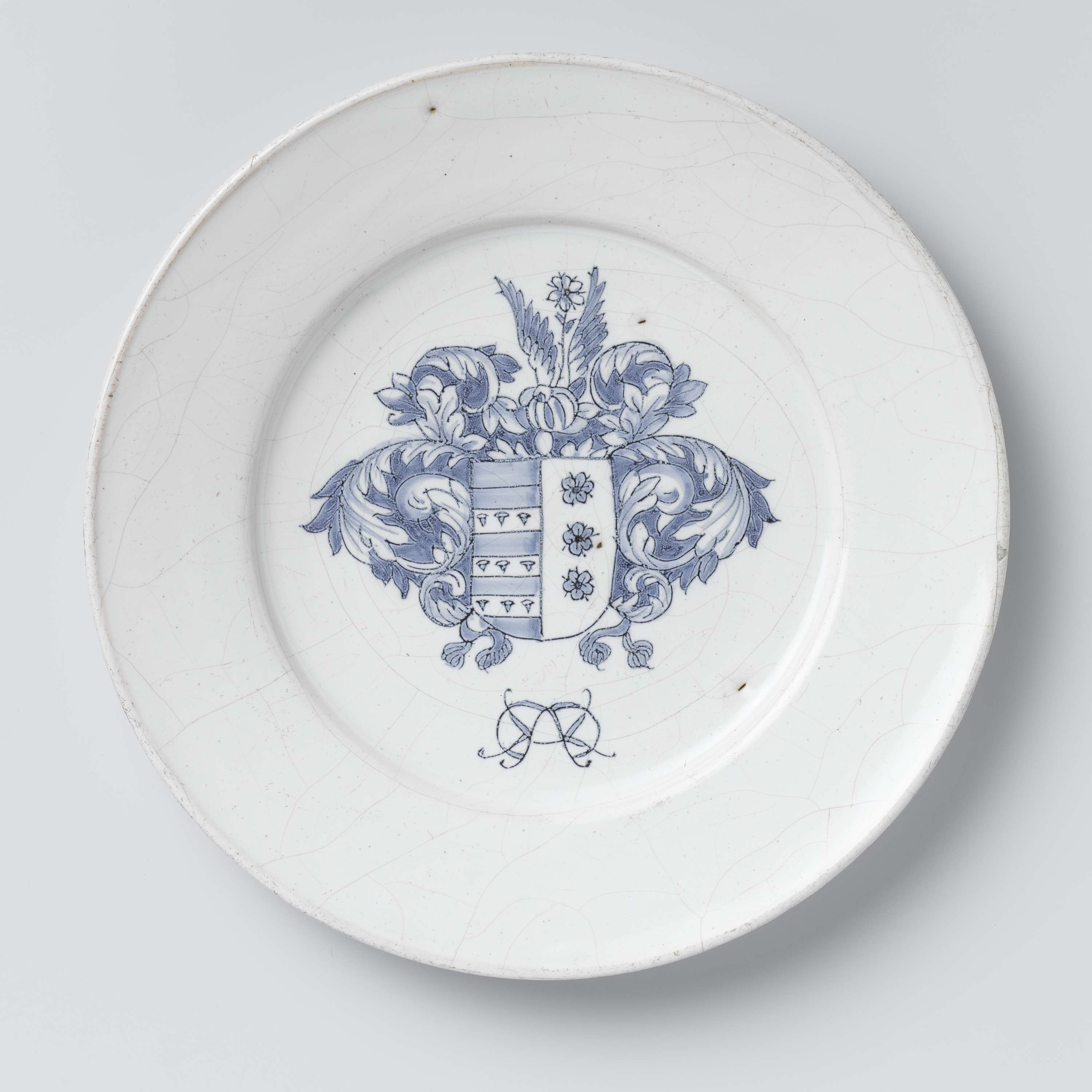 Bord van faience met een onbekend wapen, met helmteken en onbekend spiegelmonogram (Nederlands)