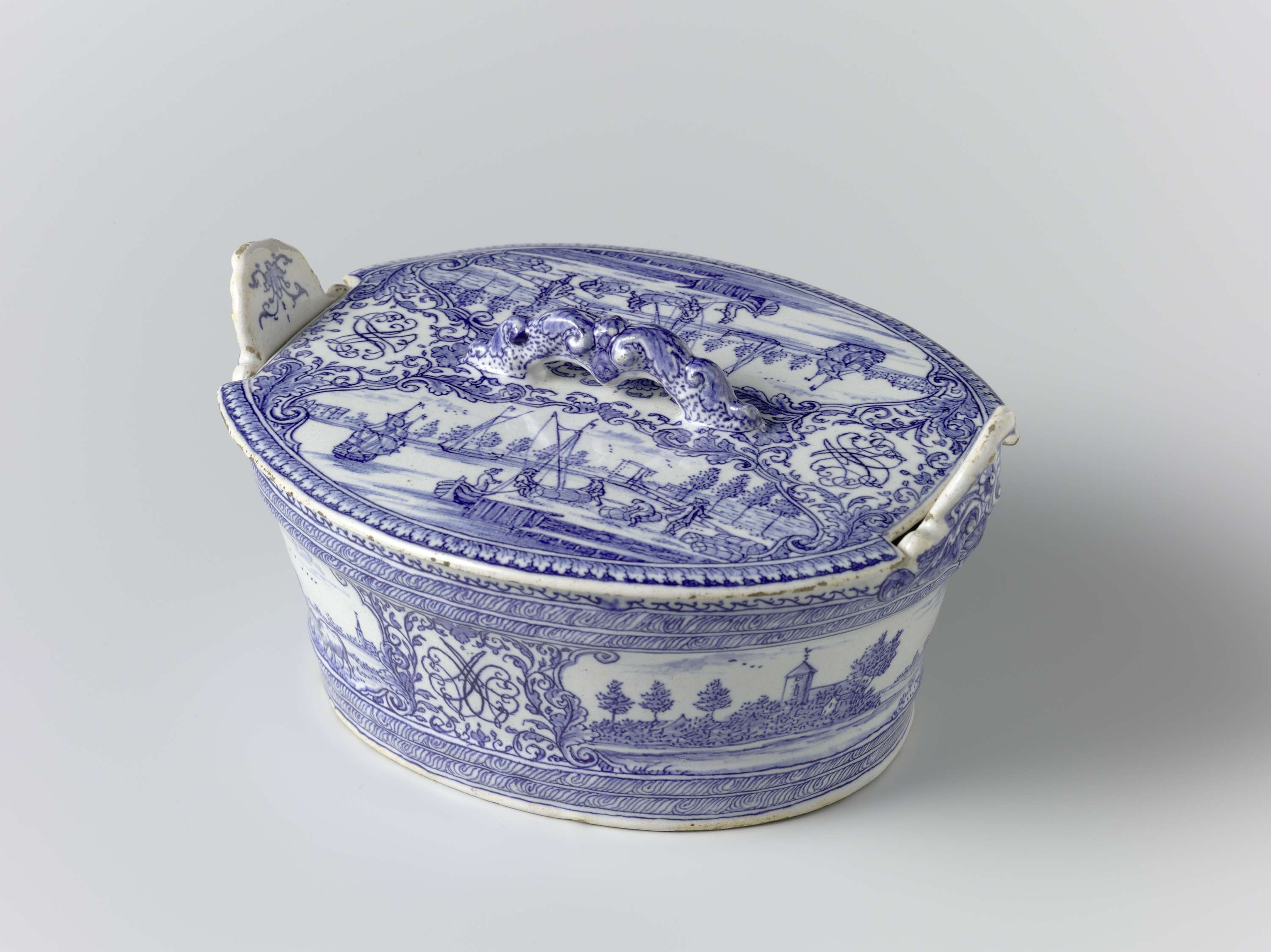 Botervloot met deksel van faïence, beschilderd in blauw met landschappen en monogram. (Nederlands)