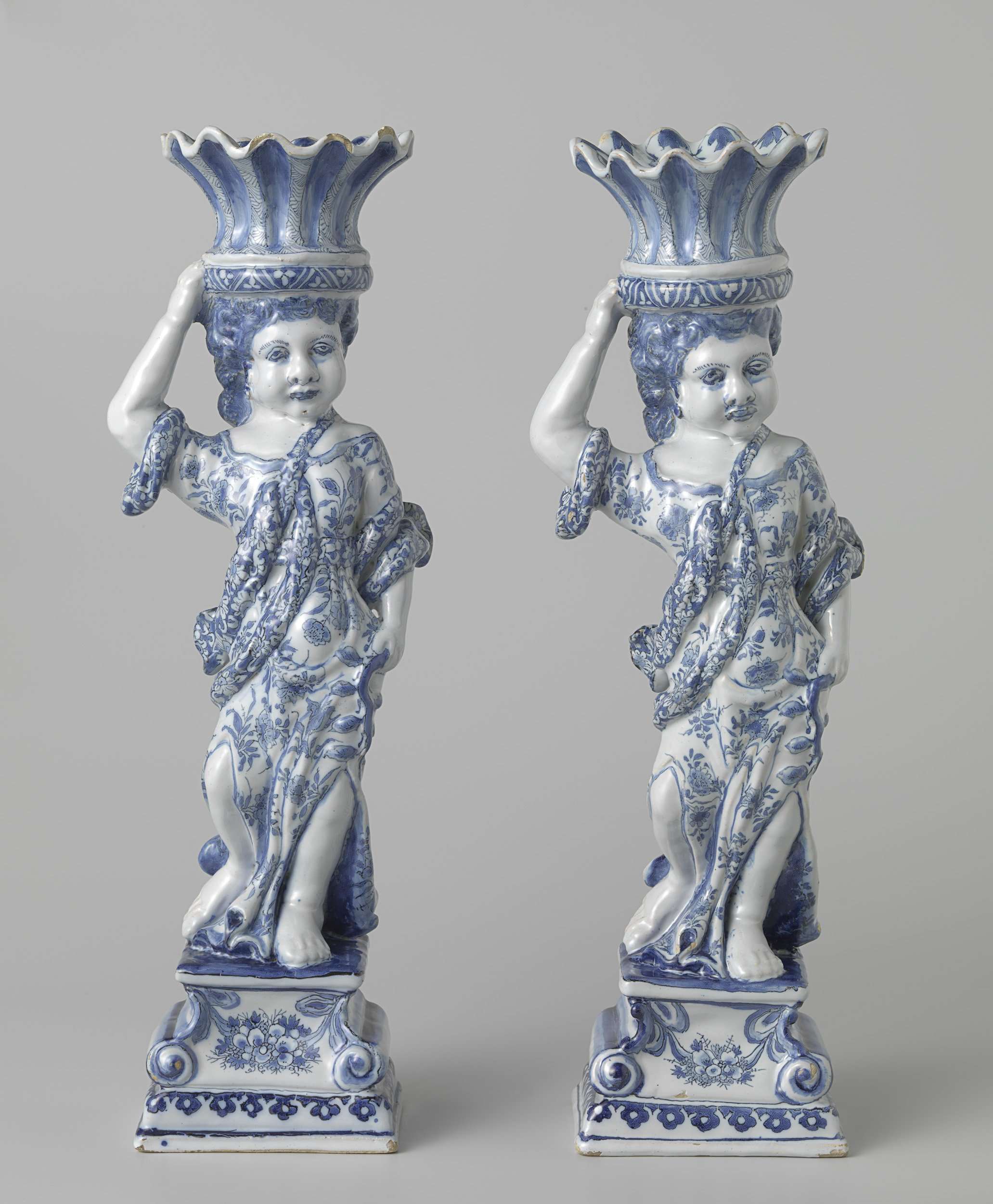 bloemhouder van faience in de vorm van een kind met een mand op het hoofd (Nederlands)