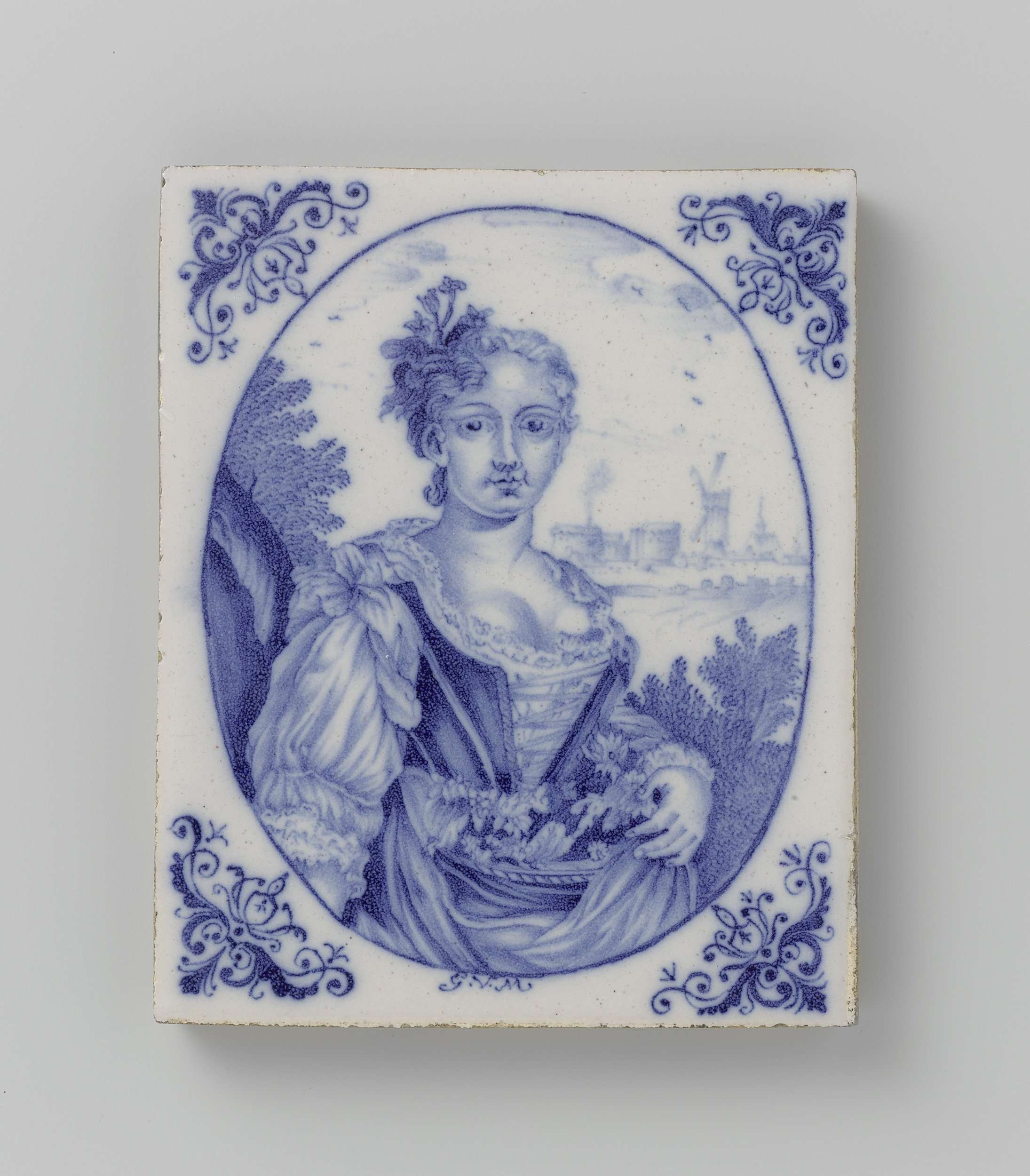 Siertegel van faience van een vrouwenportret (Nederlands)