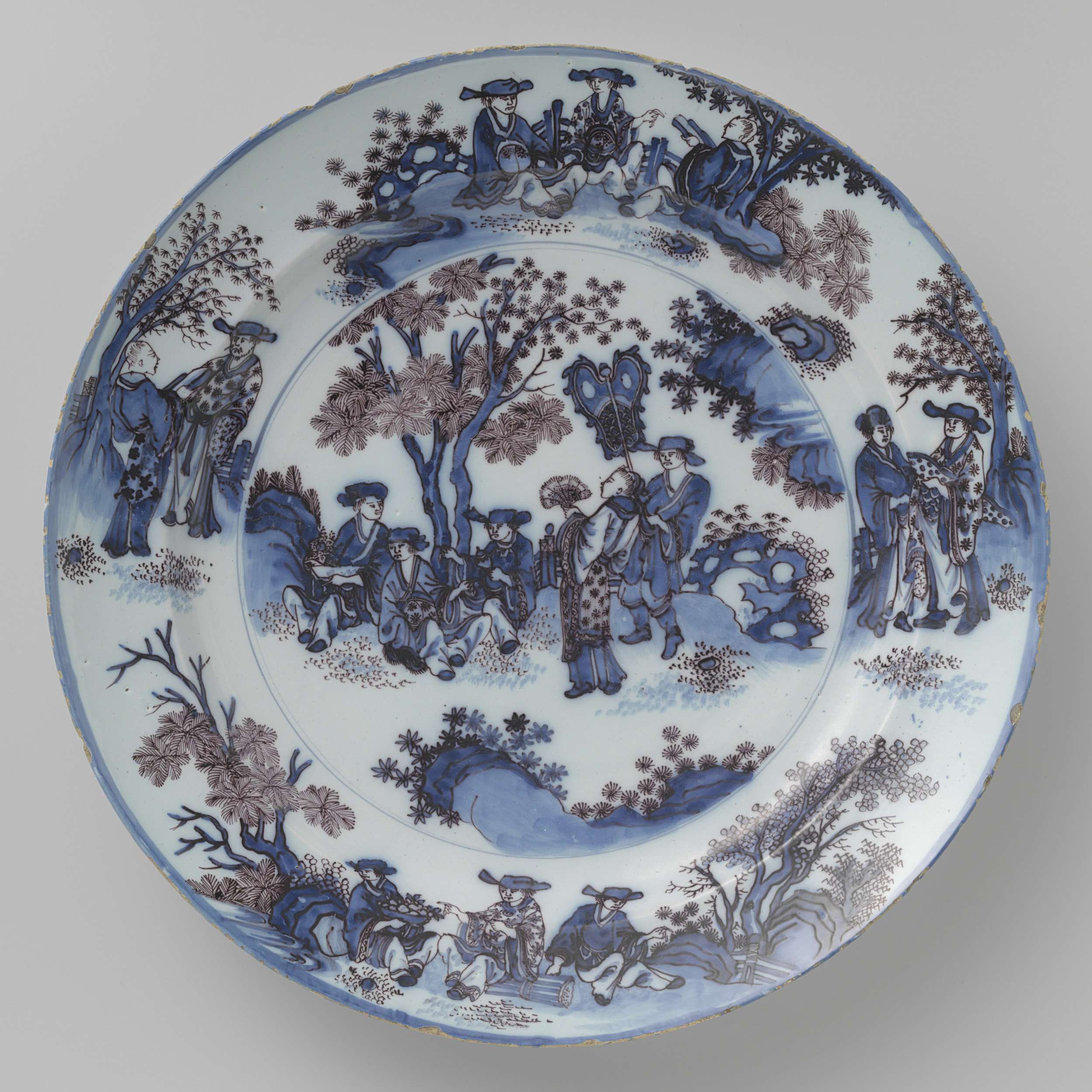 Schotel van faience met een decoratie naar het Chinese porselein uit de overgangsperiode: bedekt met tinglazuur en beschilderd in blauw en mangaan met op het plat vijf figuren in een landschap en op de rand vier groepen van twee of drie Chinese figuren. (Nederlands)