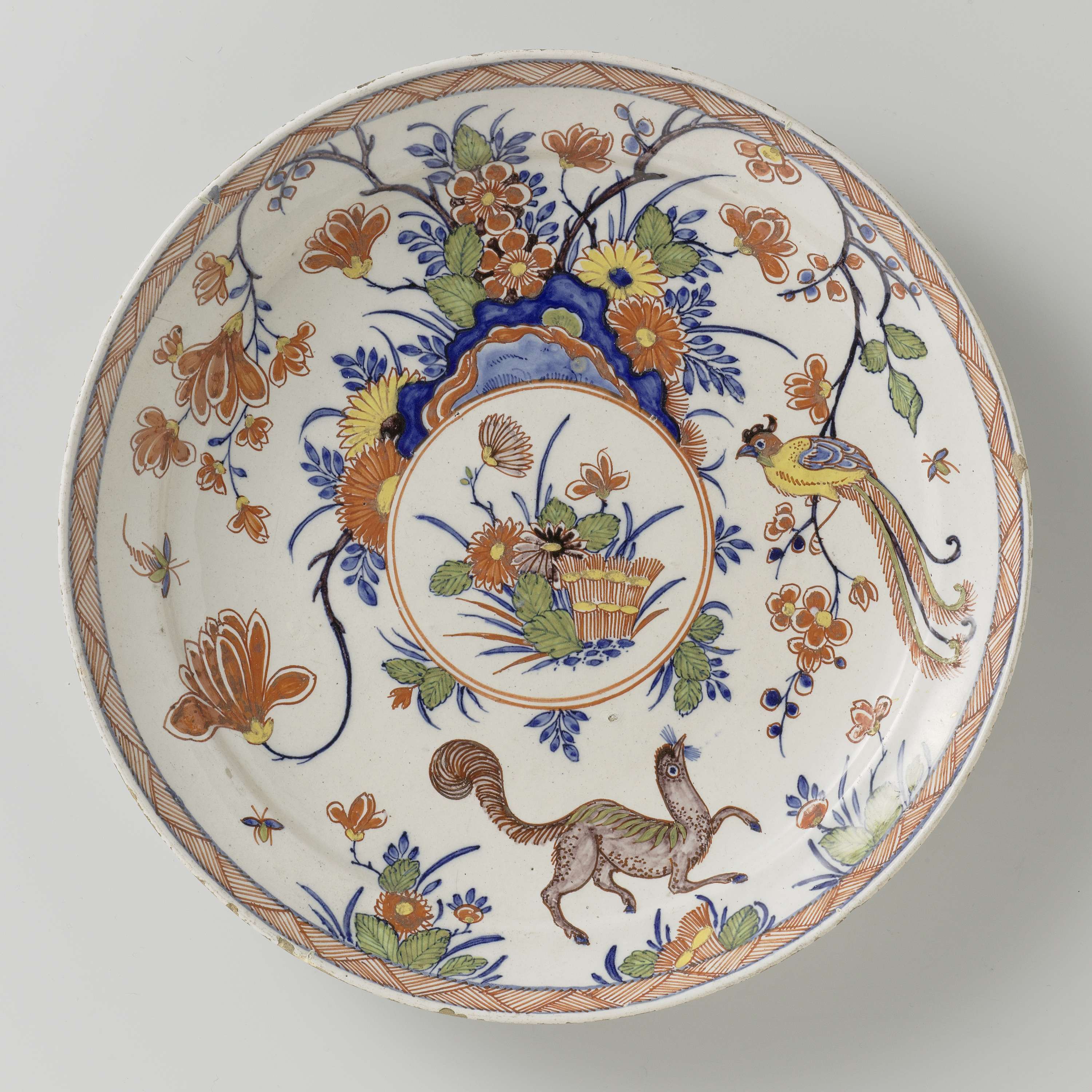 Bord van faience. Veelkleurig beschilderd naar Japans Kakiemon voorbeeld. (Nederlands)