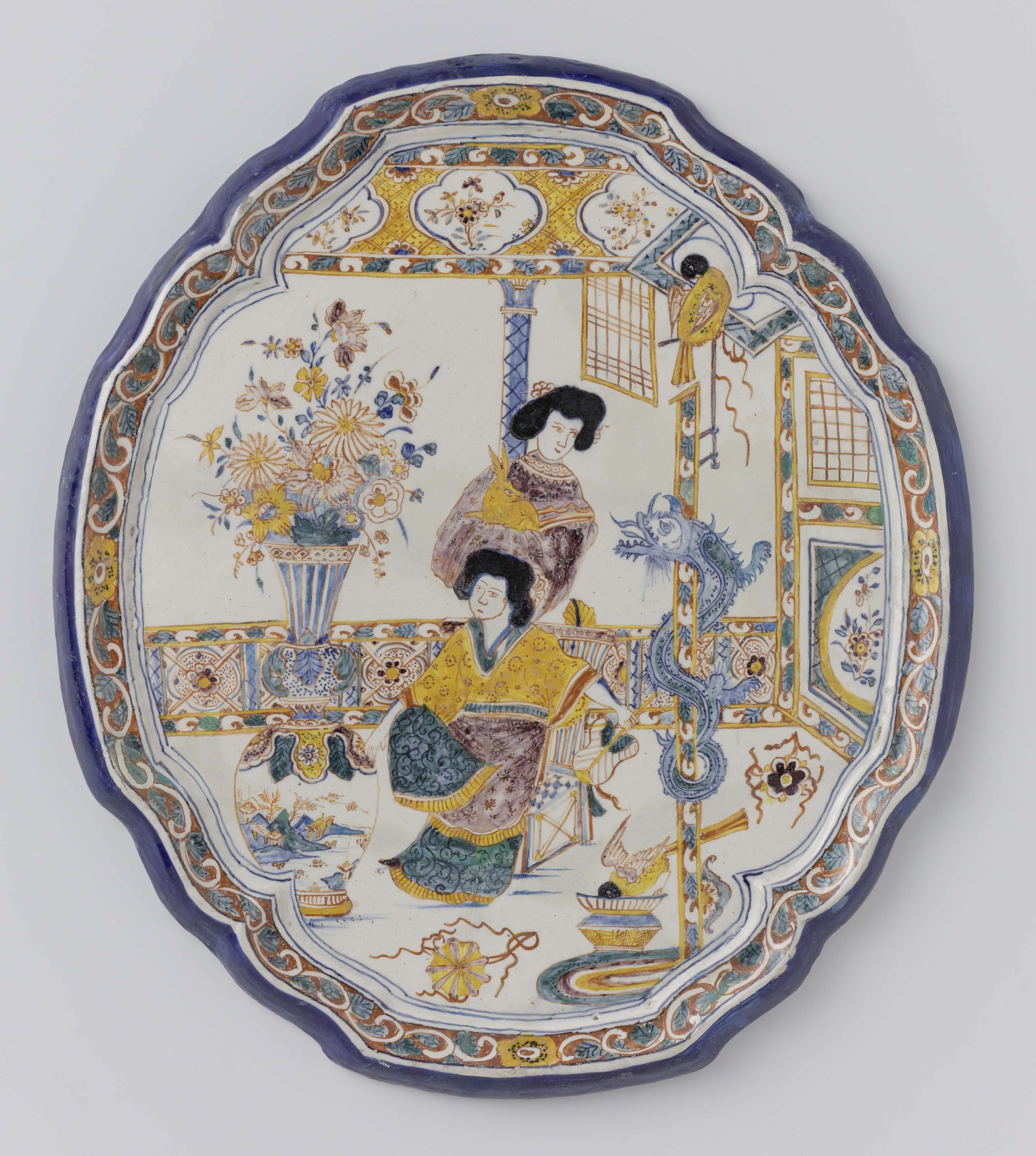 | Nederlands | Plaat, ovaal met uitgeschulpte rand. Veelkleurig beschilderd met Chinese vrouwen met bloemen en vogels op een terras |