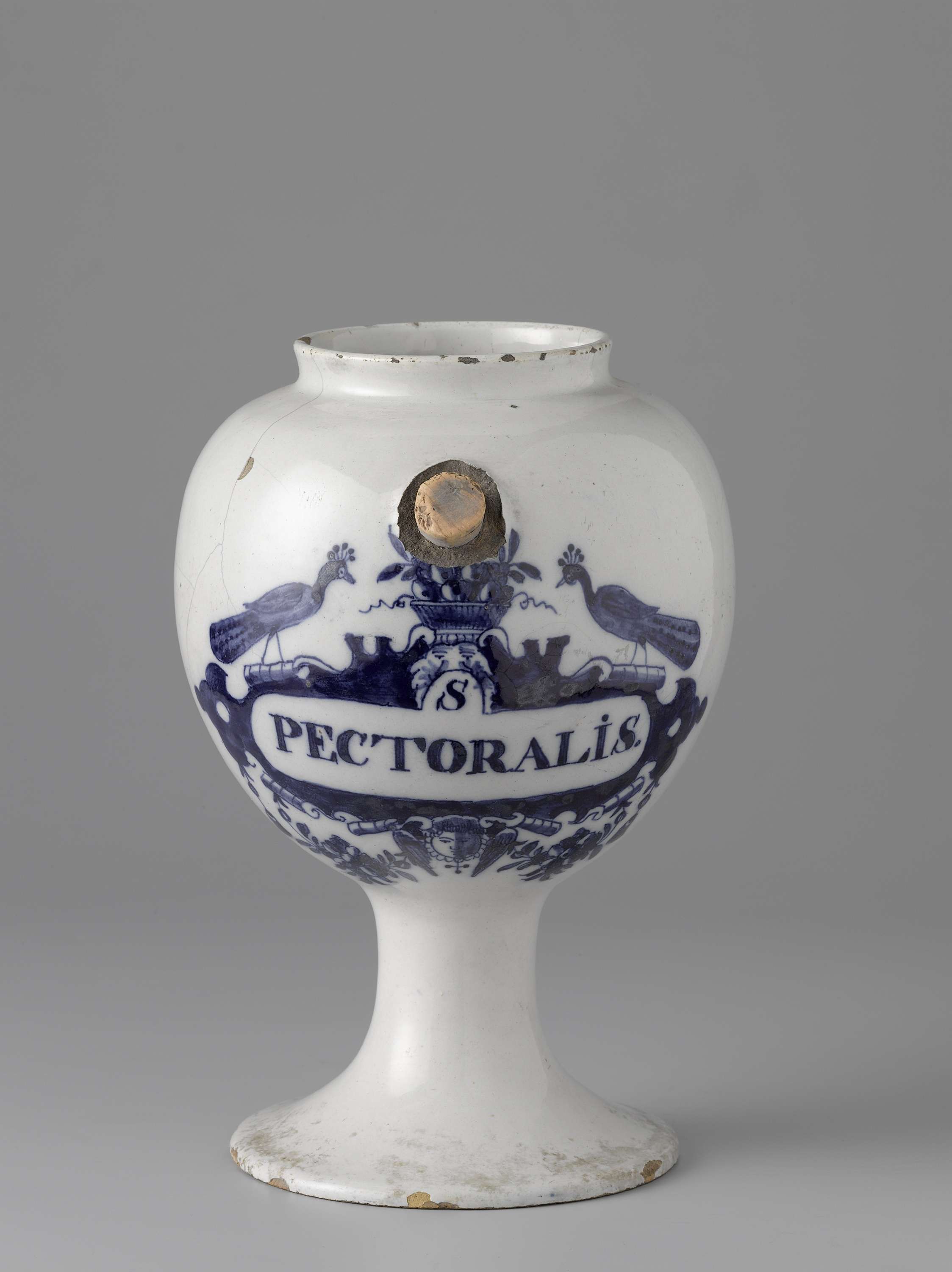 Apothekerspot van faience. Met oor en tuit en blauw beschilderd etiket met opschrift: S / Pectoralis (Nederlands)