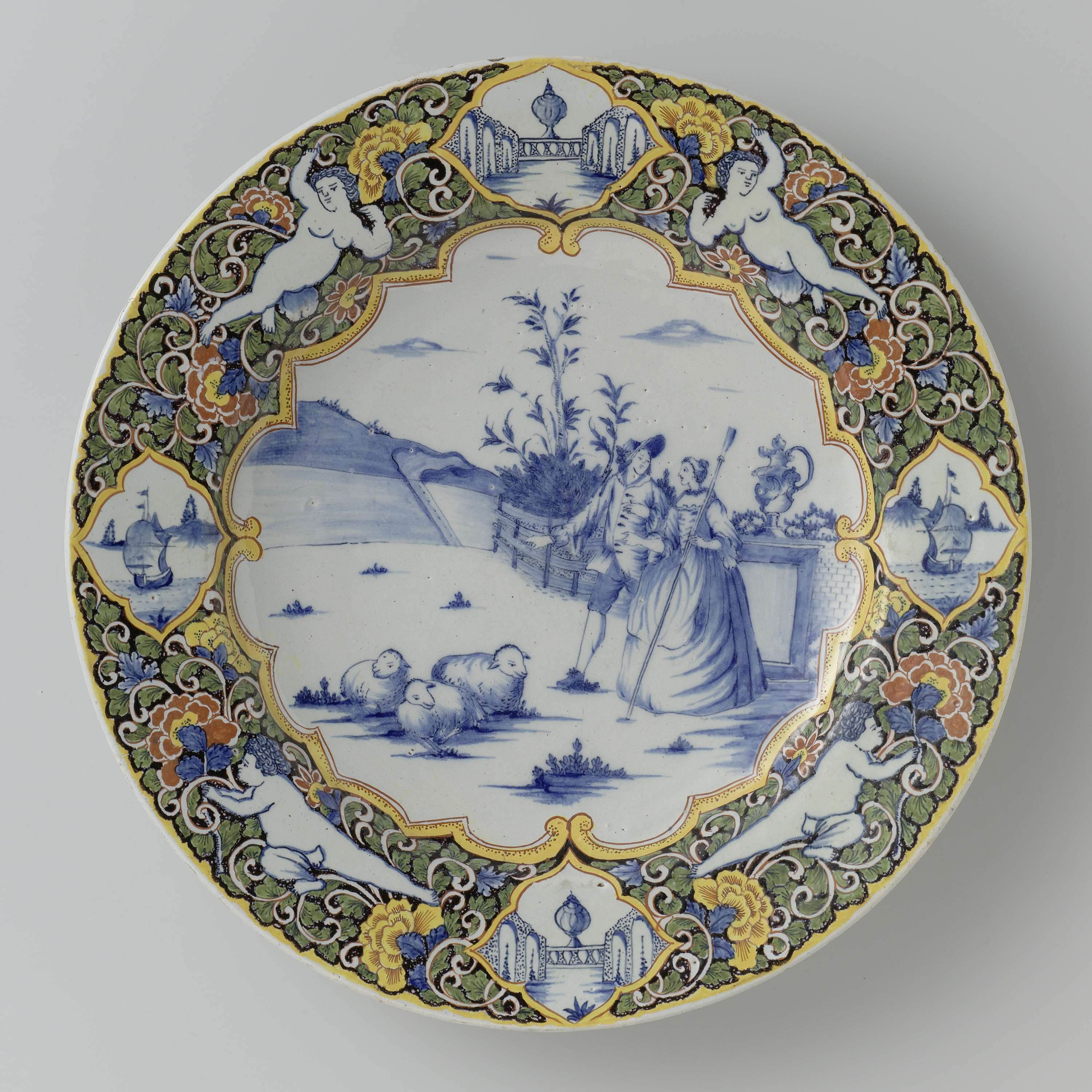 | Nederlands | Schotel met op het plat in blauw een herdersscène binnen Louis XIV rand. Veelkleurige randversiering op zwarte grond met putti en vier medaillons |