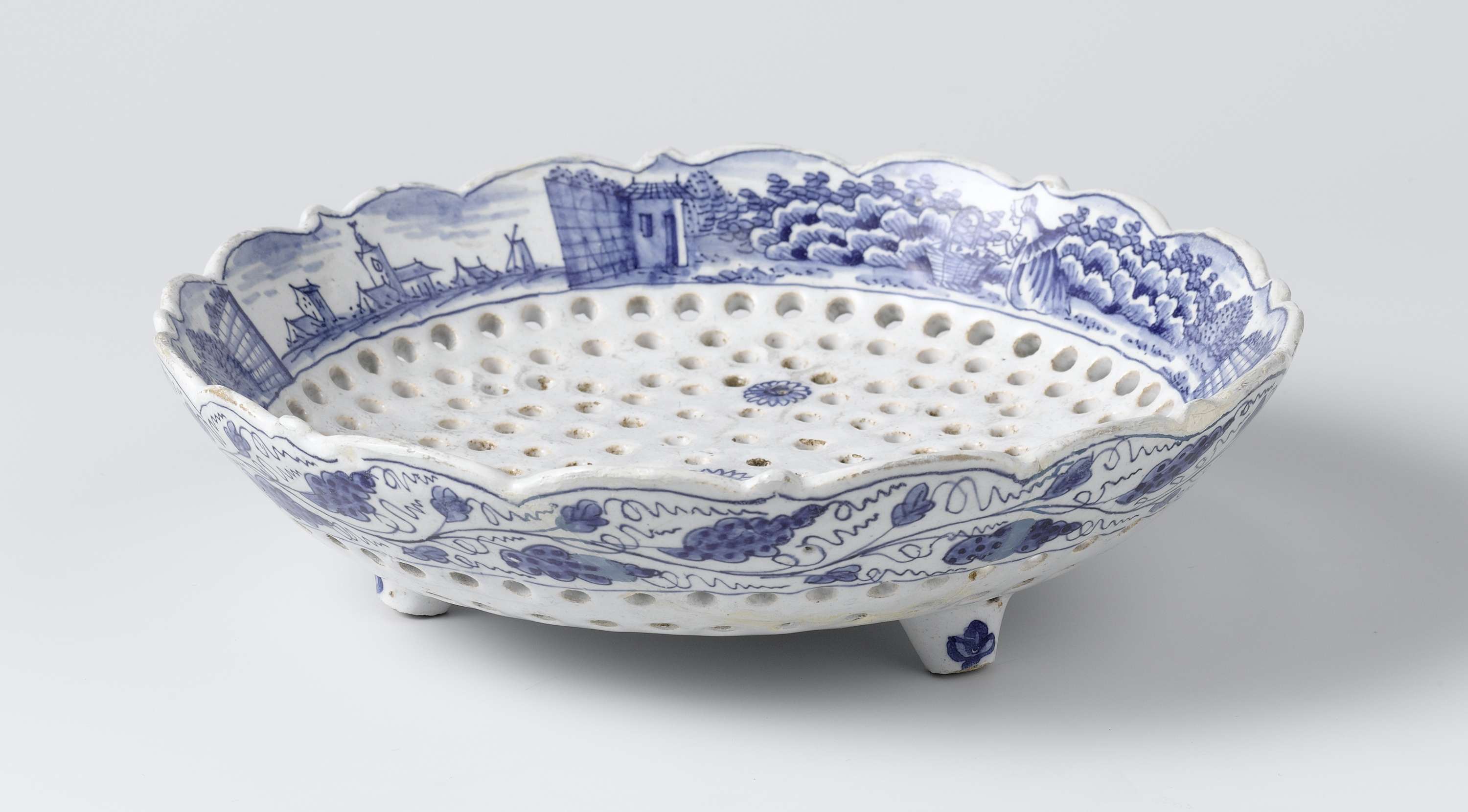 Natfruitschaal van blauw beschilderde faience, met gaatjes in een bloemvorm (Nederlands)