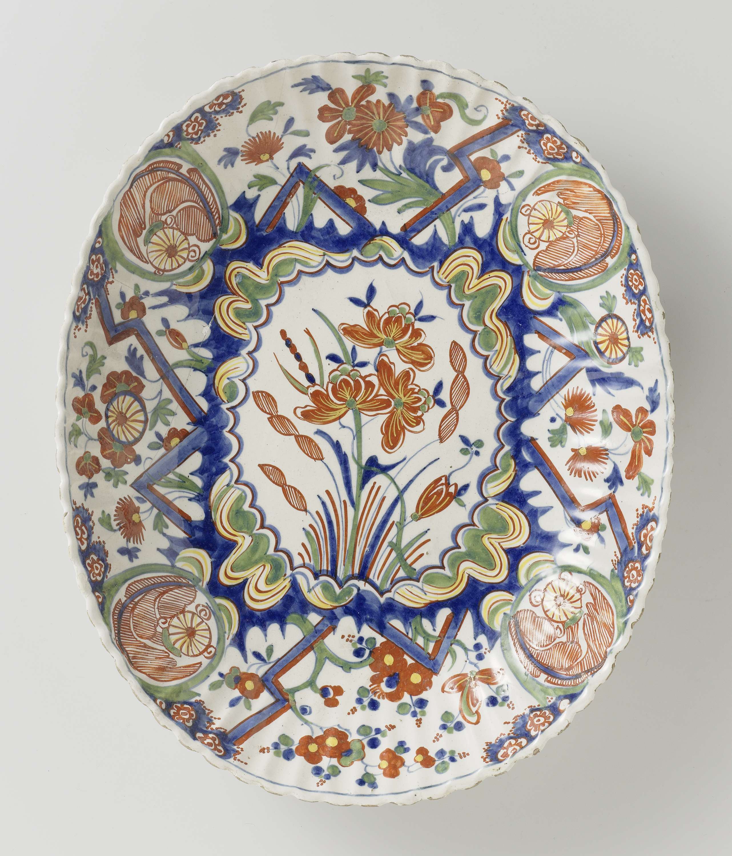 schaal, ovaal, van faience. Veelkleurig beschilderd met bloemdecoraties en zogenaamd bliksemmotief. Rand gecanneleerd. (Nederlands)