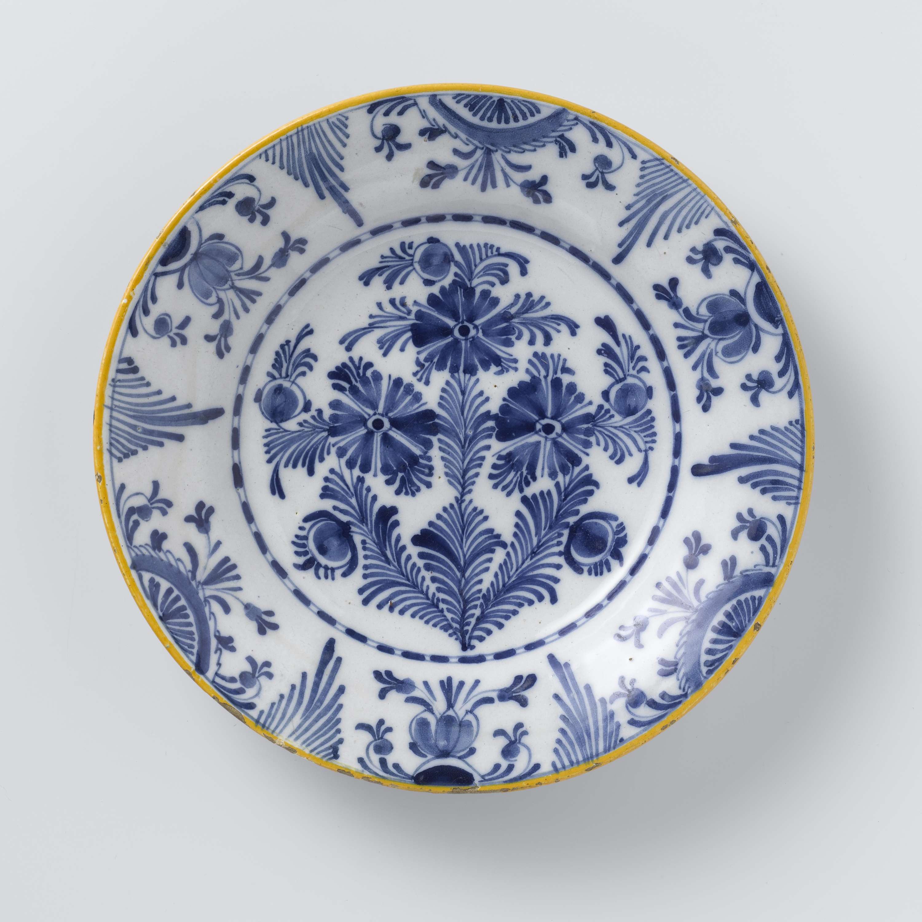 Bord van faience, met gele bies. Blauw beschilderd met een boeket. (Nederlands)