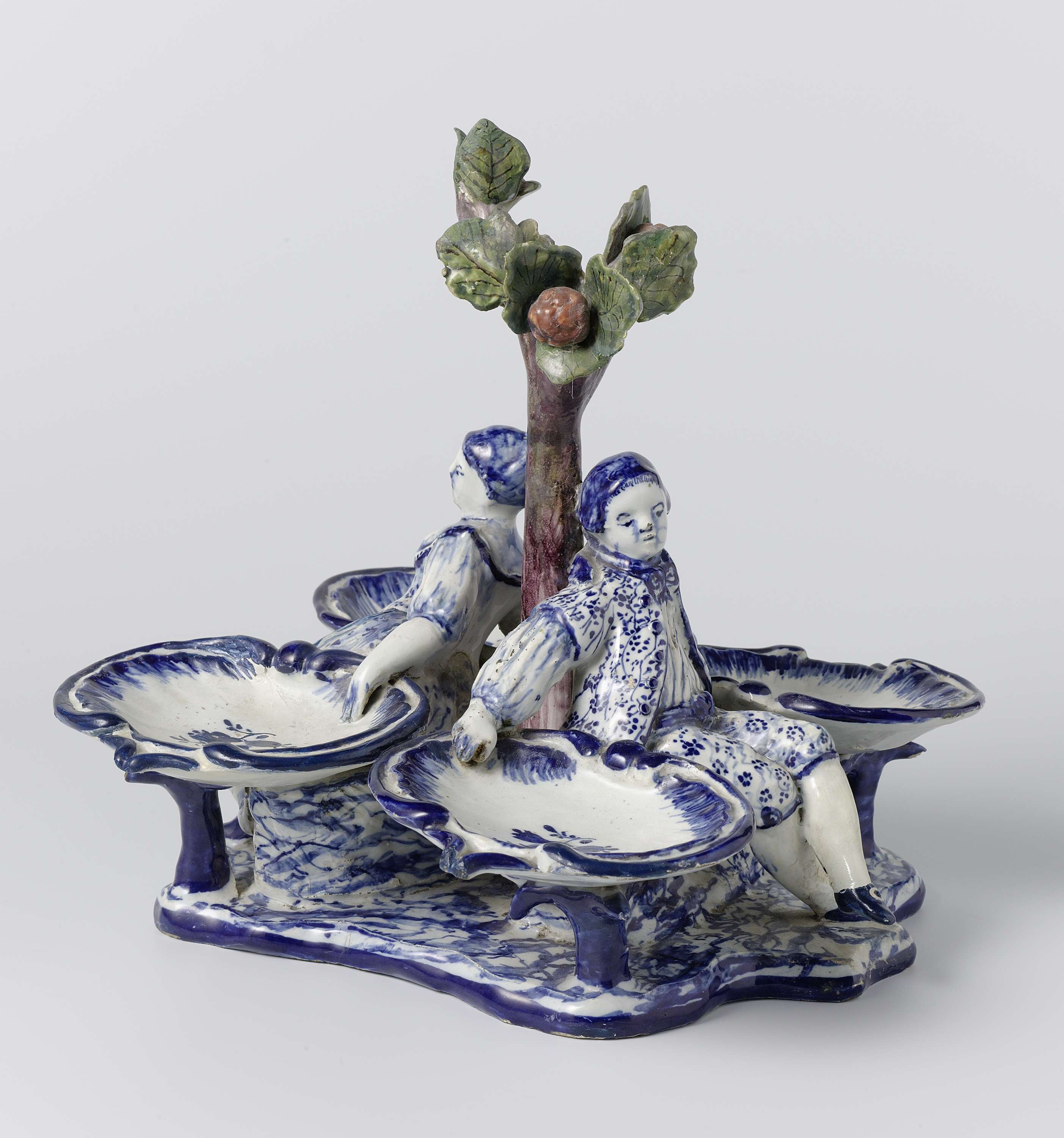 Zoutvat van faience. Bestaande uit een jongen en een meisje gezeten tegen een boom, daar omheen 4 schaaltjes. (Nederlands)