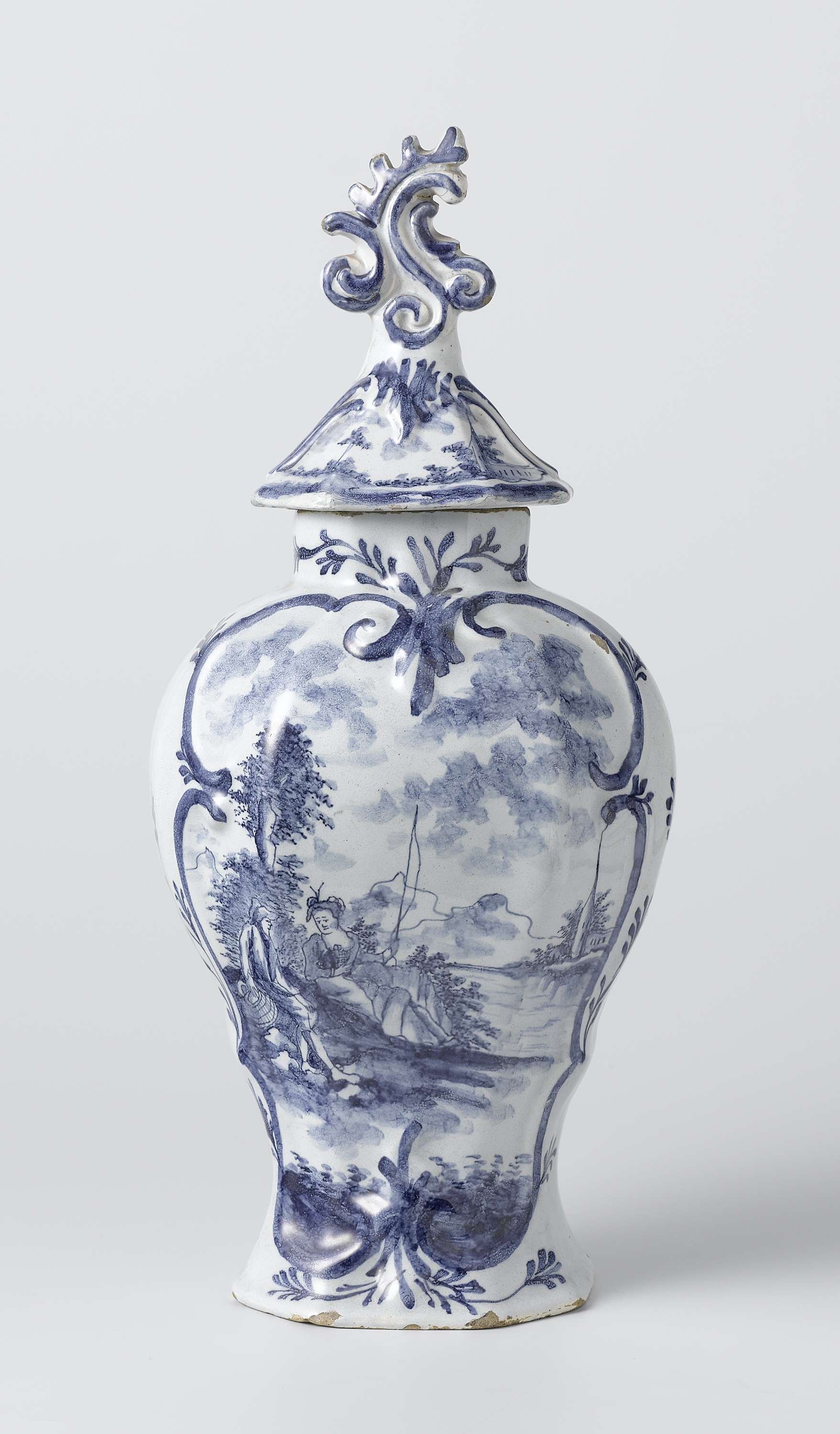 Pot met deksel van faience, met deksel. Blauw beschilderd met een landschap. (Nederlands)