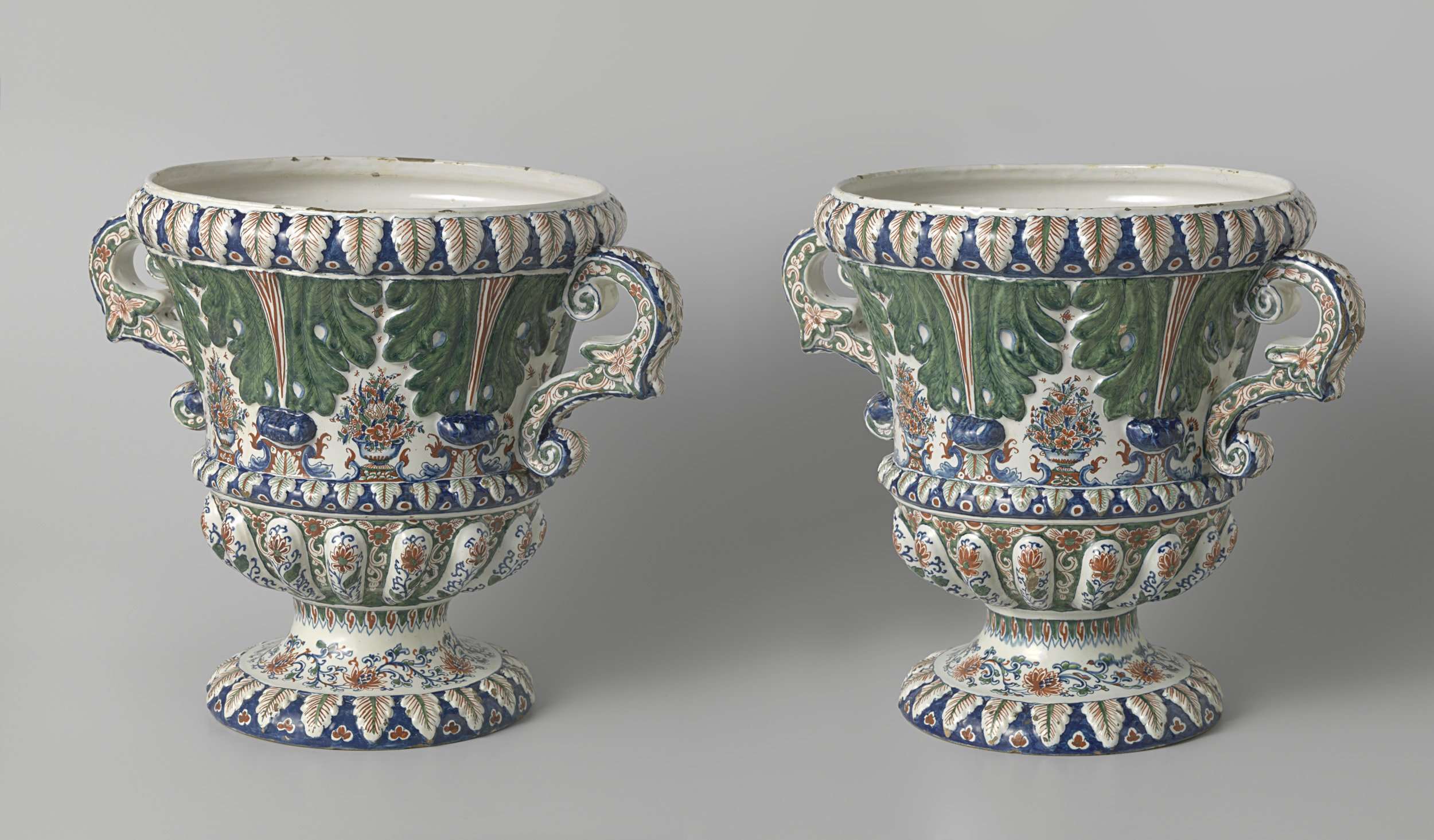 tuinvaas van aardwerk. De vaas staat op een lage ingesnoerde voet en heeft twee oren met voluten. Het vaas is aan de onderzijde afgerond en voorzien van knorren. OP het lichaam grote groene acanthusbladeren in reliëf, die van de bovenrand naar beneden hangen. Langs voet- en mondrand, op een rand boven de knorren en op de oren afhangende bladeren in reliëf op blauw fond. Tussen de acanthusbladeren zijn vazen met bloemen geschilderd; op de knorren bloemen; op de voet een doorlopende bloemenrank; alles in rood, groen en blauw. Tussen de knorren zijn bloemenmotieven uitgespaard in een groen fond. Op de oren randen uitgespaard in een groen fond. (Nederlands)