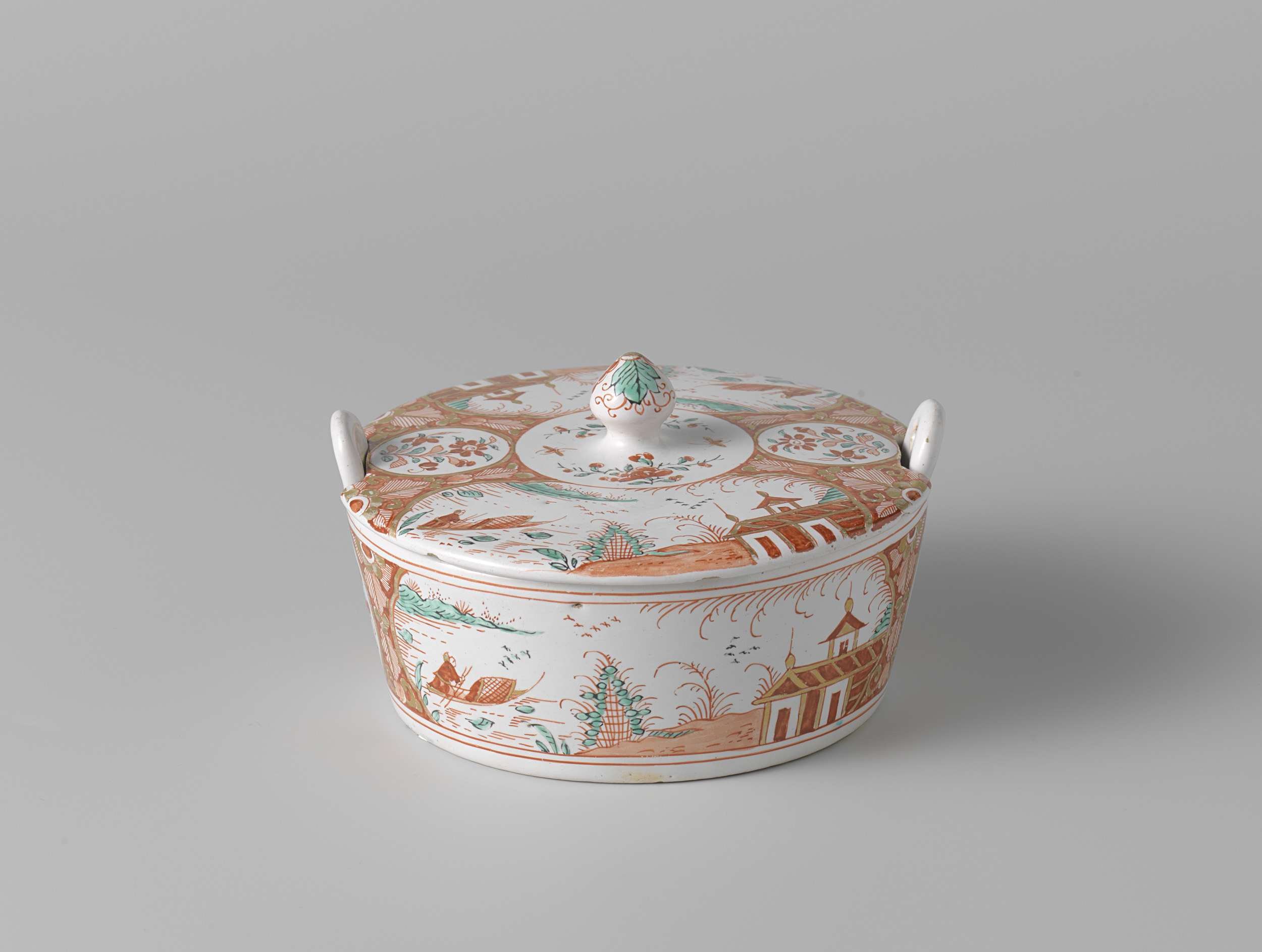 Botervloot met deksel met opstaande oortjes veelkleurig beschilderd met een oosters landschap met gebouwen binnen cartouches. (Nederlands)