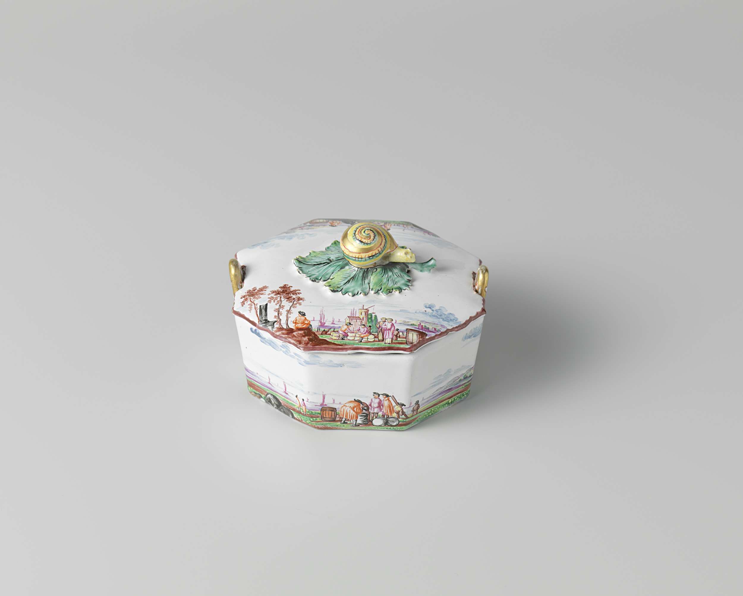 Achtkantige botervloot (A) met deksel (B) en als knop een slak, veelkleurig beschilderd met een mediterraan landschap. Gemerkt VA in onderglazuurblauw. (Nederlands)