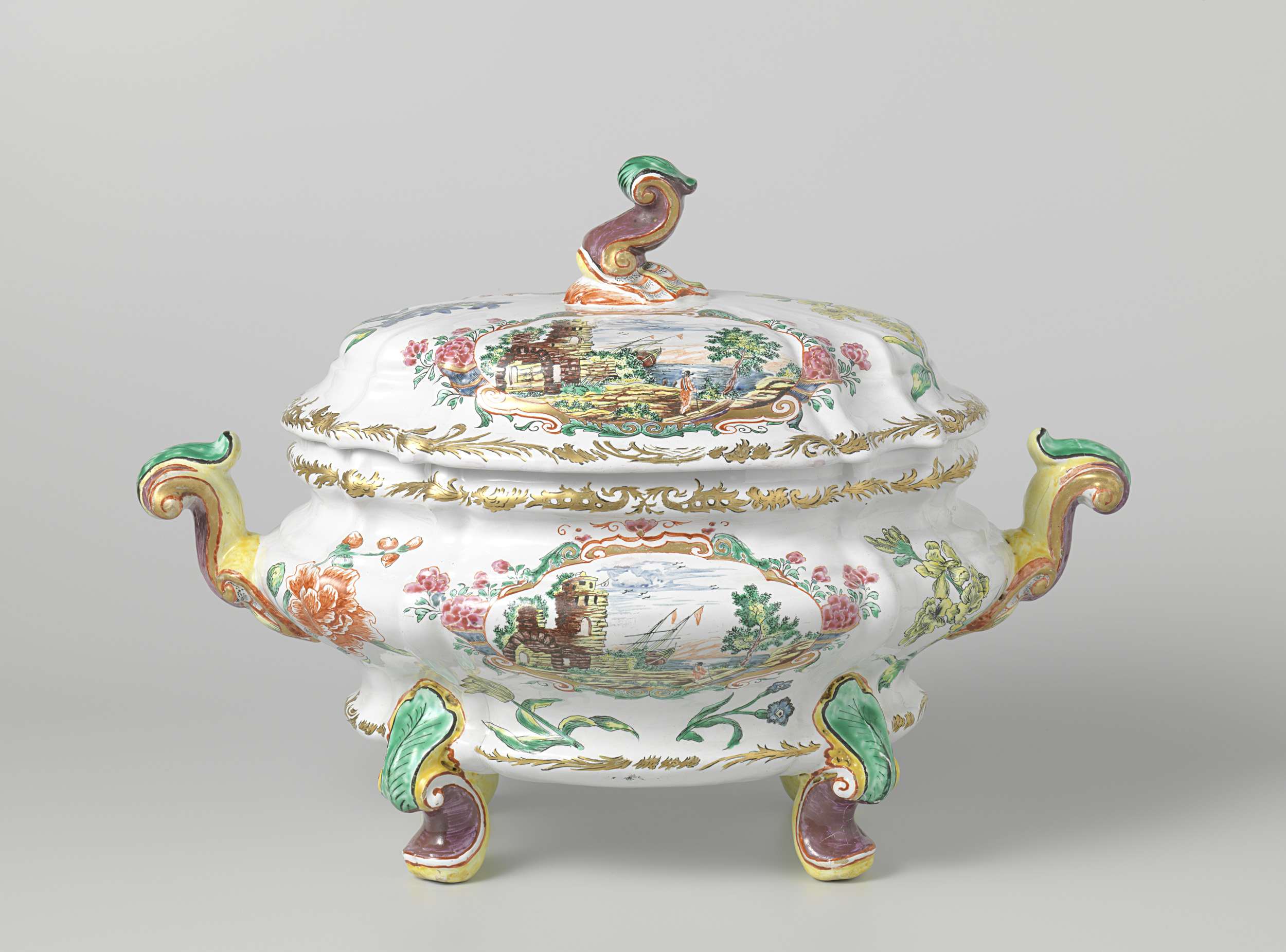 Terrine (A) met deksel (B) op vier gekrulde poten. Het deksel en de gewelfde wand veelkleurig beschilderd met een landschap met ruïne, figuur en schip in een cartouche omgeven door bloemtakken. (Nederlands)