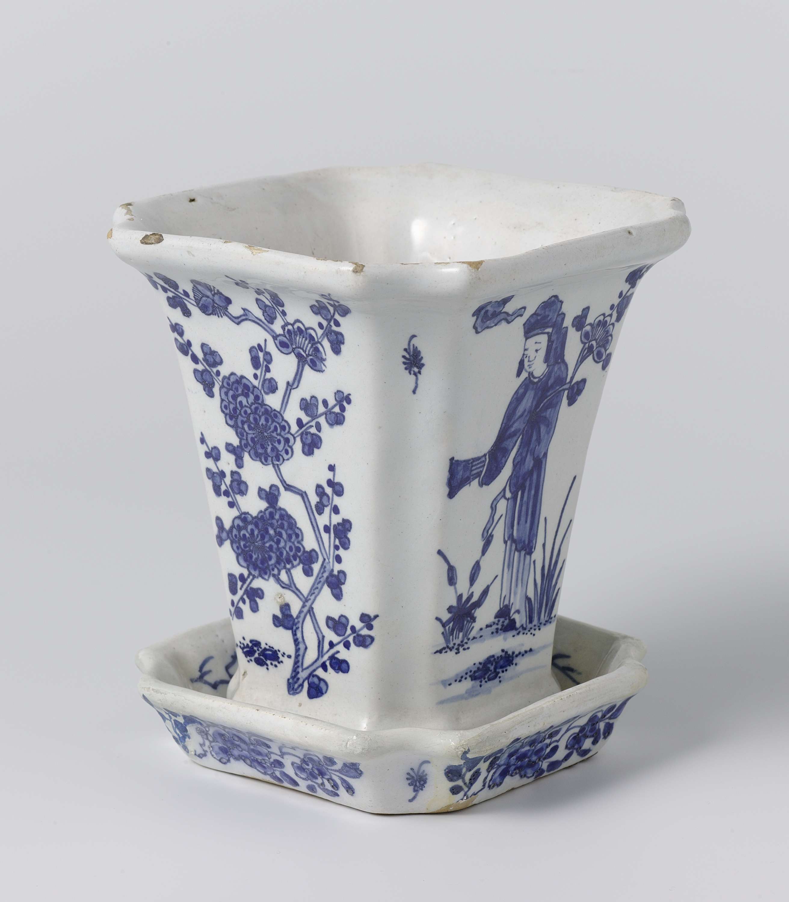 Bloempot van faience. Blauw beschilderd met bloemtakken en Chinese vrouwen. (Nederlands)