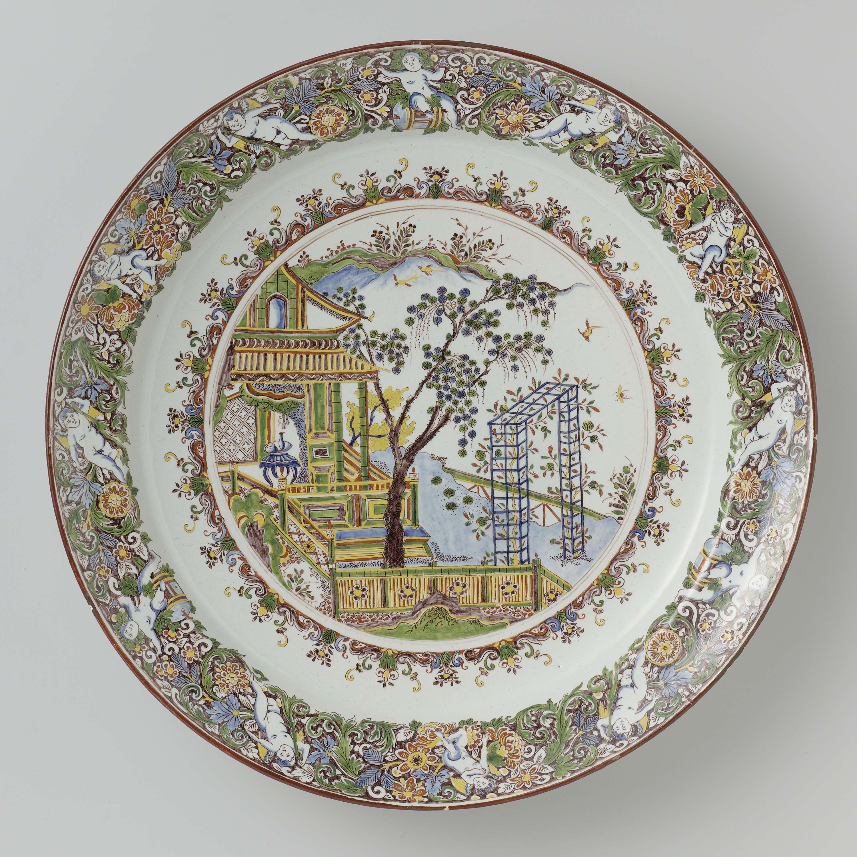 Schotel van faïence, veelkleurig beschilderd met Chinoiserie: op het plat een huis met bloeiende bomen. Rand met bloemenrank en putti. (Nederlands)