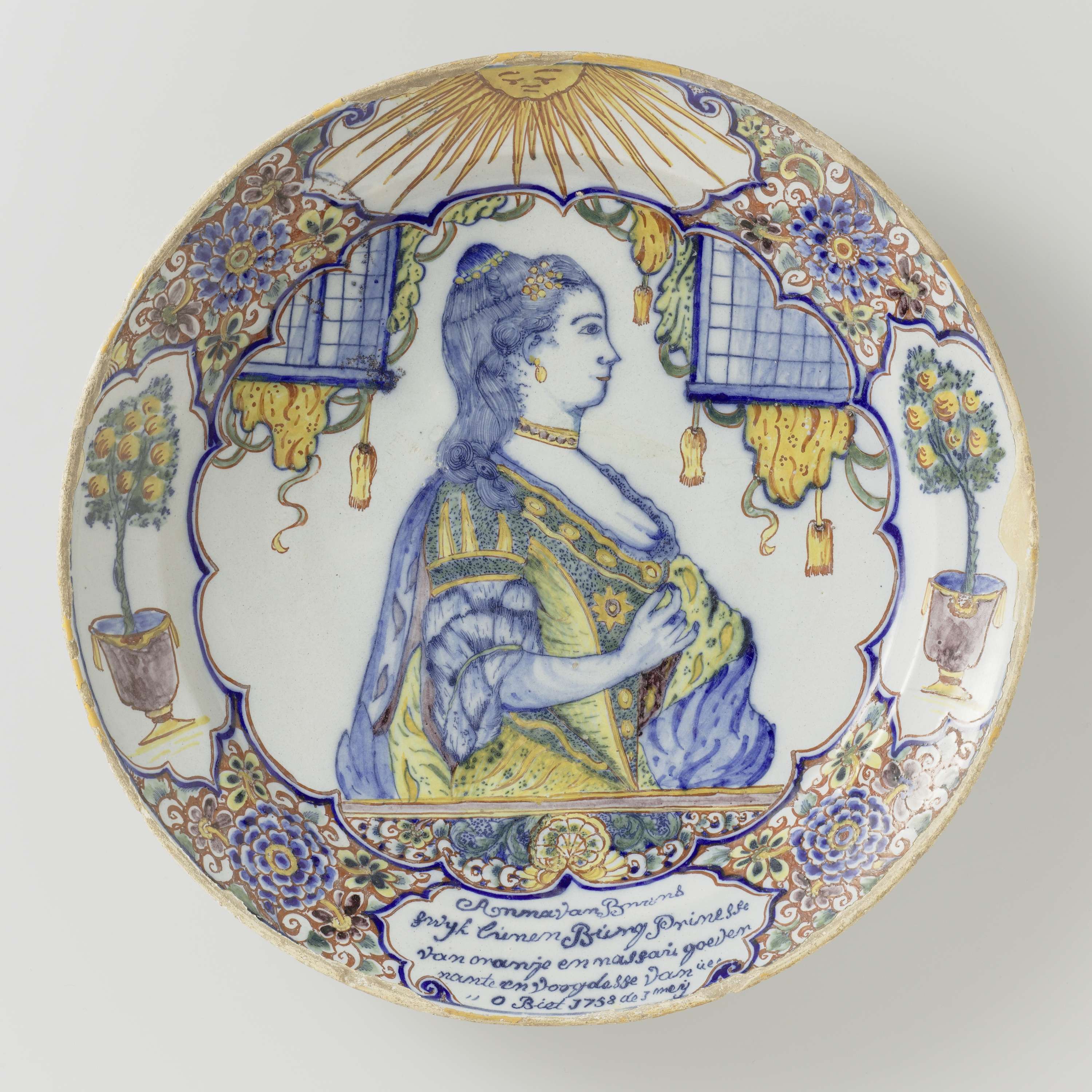 | Nederlands | Schotel, beschilderd met portret Anna van Hannover, echtgenote van stadhouder Willem IV |