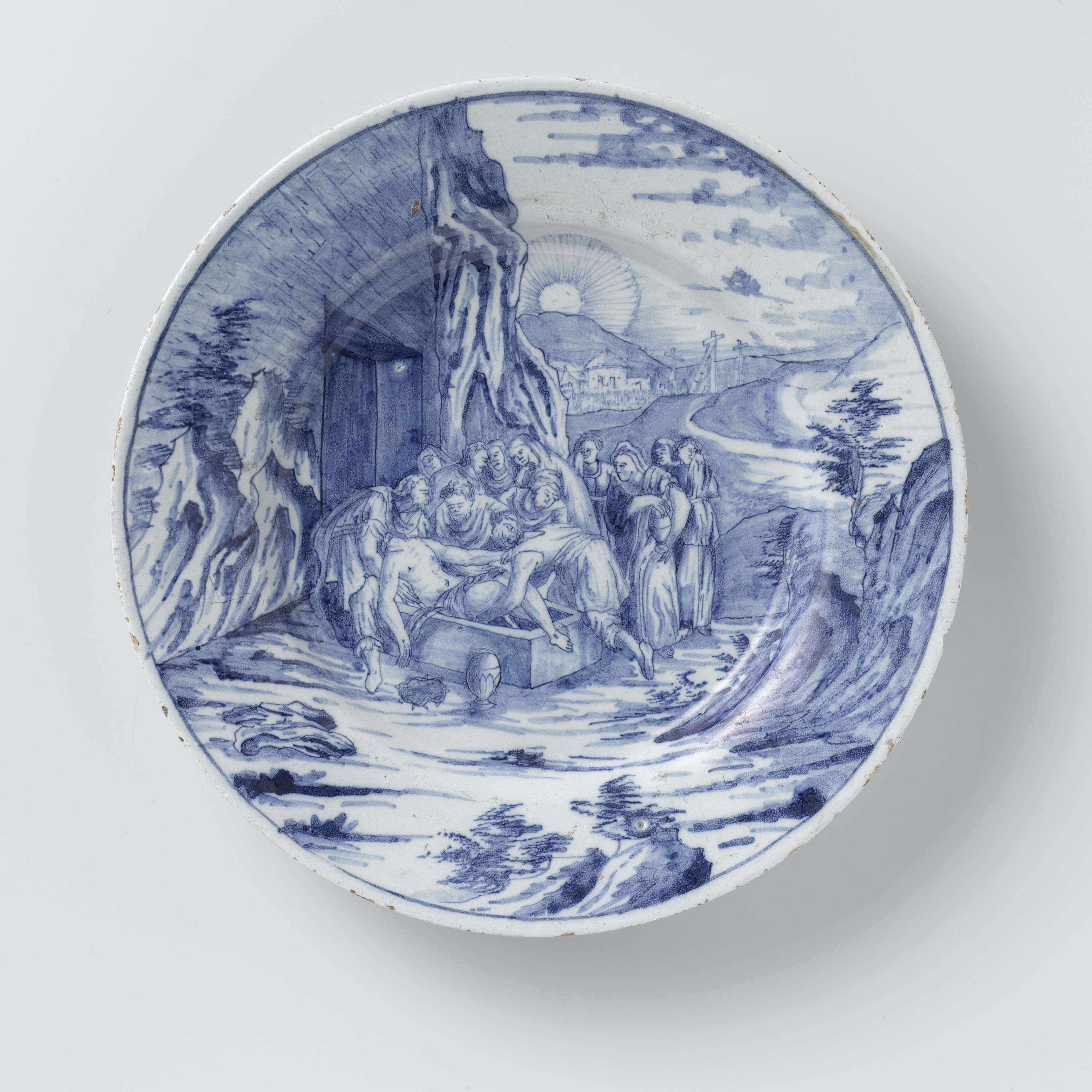 Bord van aardewerk, blauw beschilderd op tinglazuur met de graflegging van Christus over het gehele oppervlak beschilderd. (Nederlands)