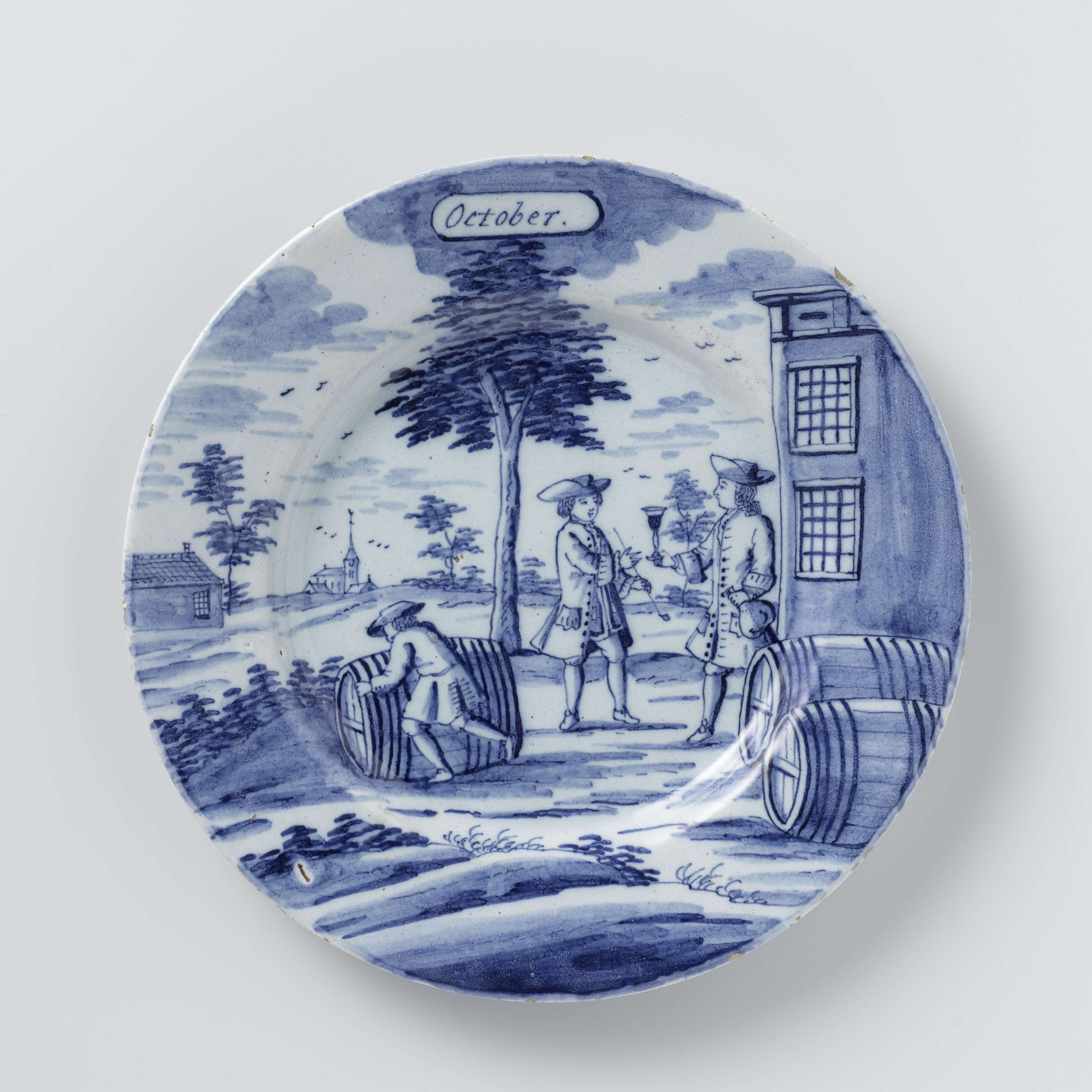 Bord van faience, uit de serie de 12 maanden. Voorstellende de maand oktober. Afgebeeld is: de wijnoogst, met de tekst: October. (Nederlands)