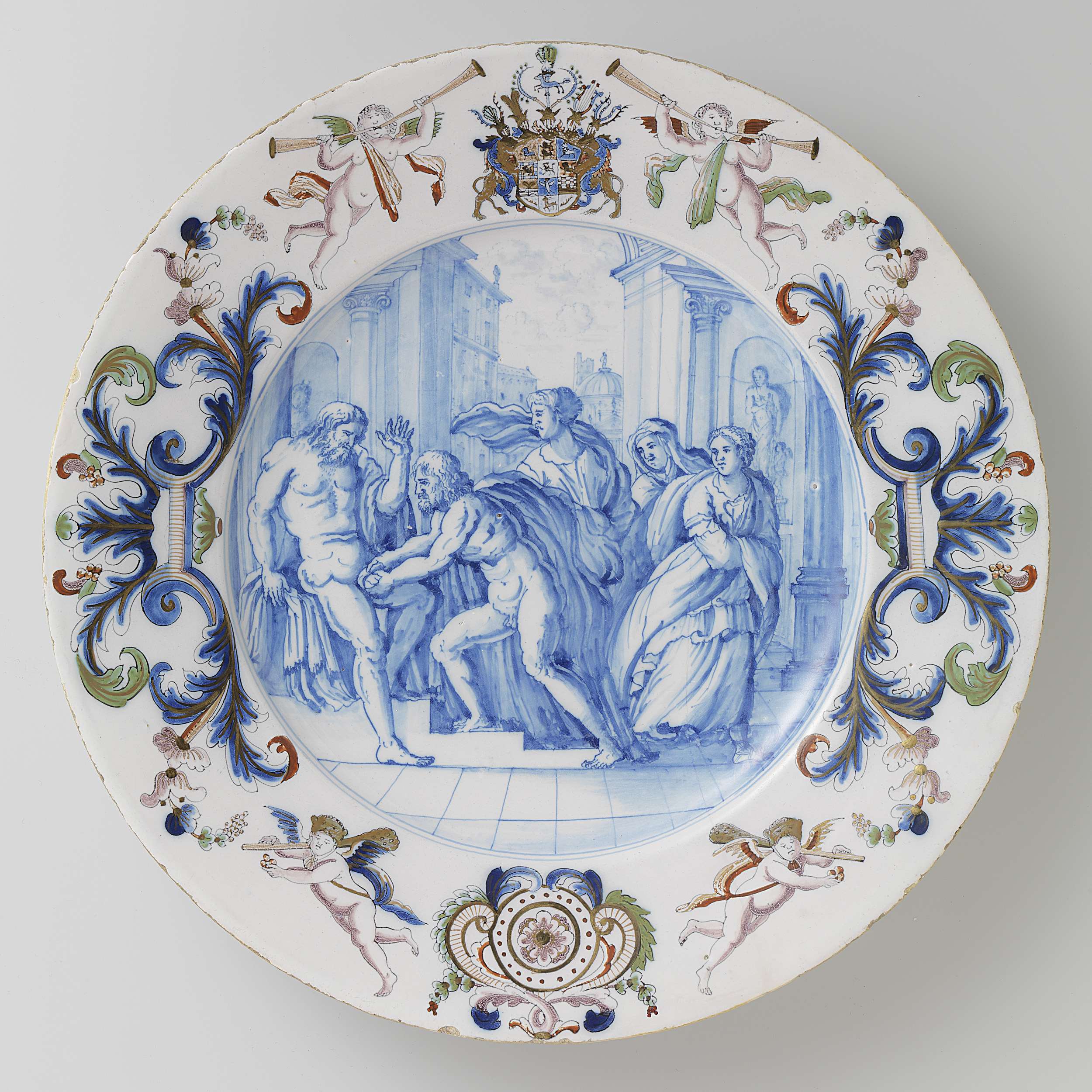 Schotel van faience, met voorstelling van de ontmanning van Uranus door Kronos. Op de rand het wapen van de hertogen van Braunschweig en Lüneburg. Veelkleurig beschilderd. (Nederlands)
