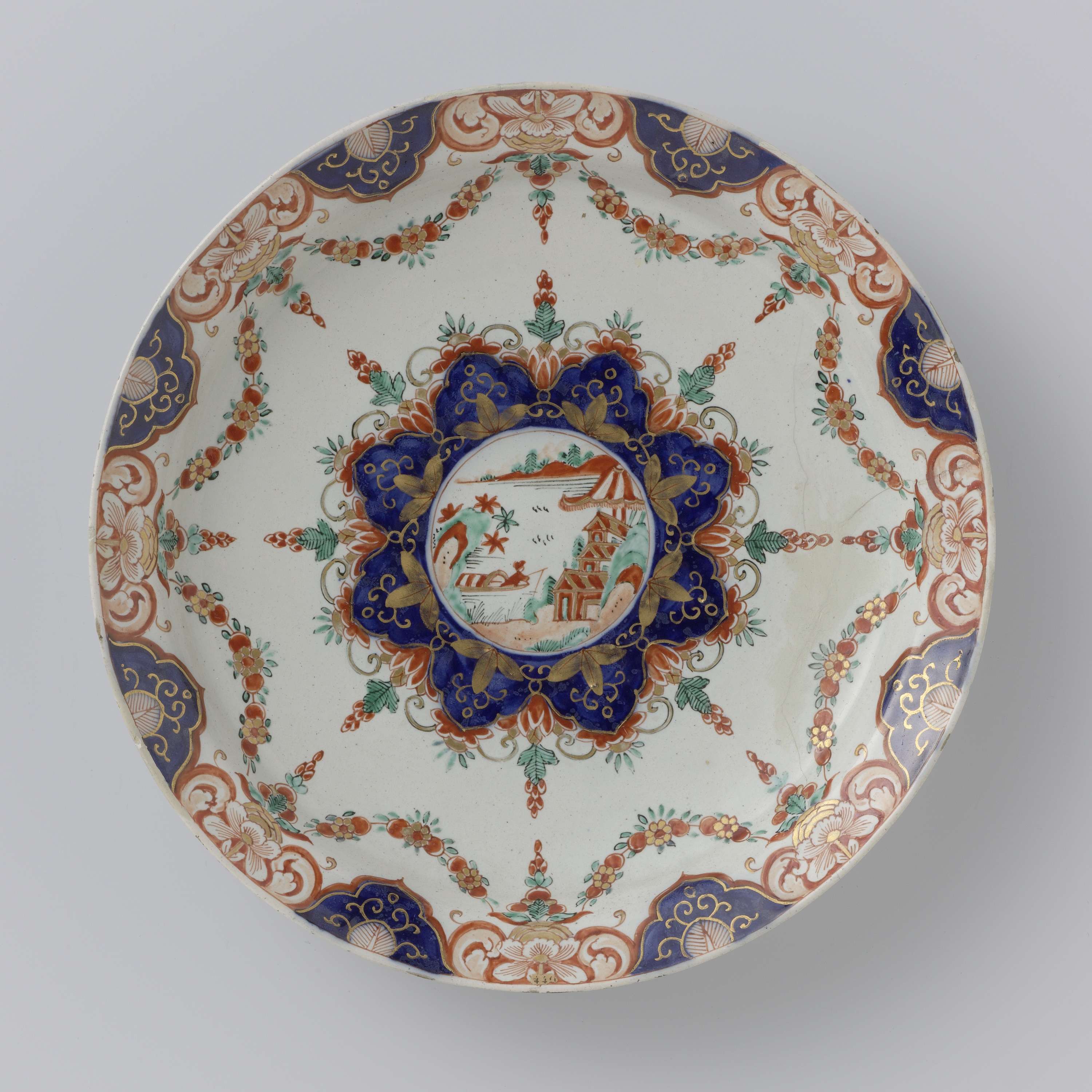 Bord van faïence. Veelkleurig beschilderd met een chinees waterlandschap en lambrequins, in imari kleuren. (Nederlands)