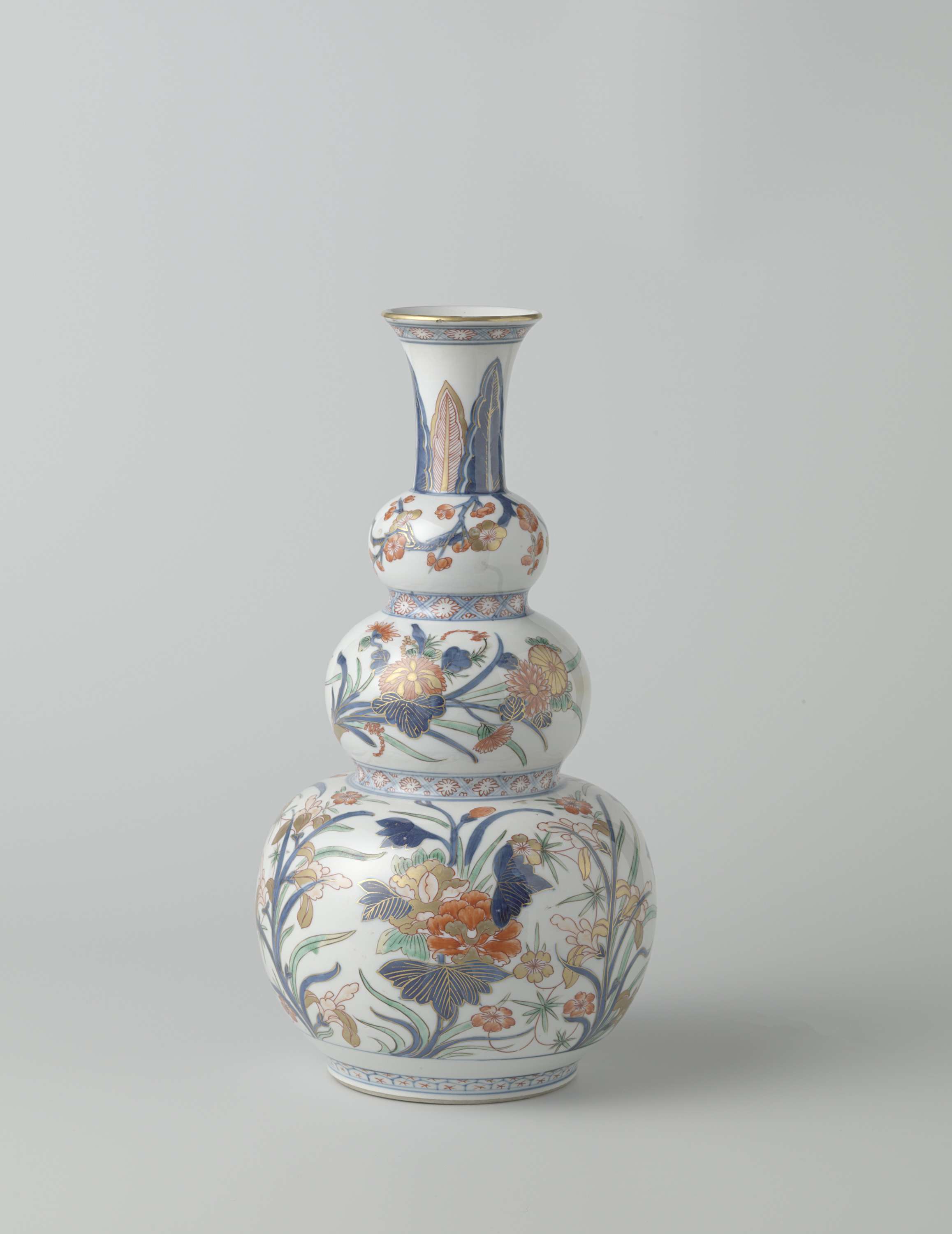 Triple gourd vase painted in Japanese style with large flower sprays (Engels)
