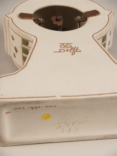 Pendule met uurwerk van porselein-biscuit (mat, ongeglazuurd), gedecoreerd met abstracte, gestileerde motieven en aan we...e Fles v/h Joost Thooft en Labouchère, Delftsch Aardewerkfabriek||Comte, Adolf le||Keramiekmuseum Princessehof OKS 1995-005