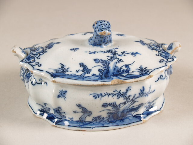 Geschulpt ovale botervloot met aan weerszijde een plat opstaand greepje, waartussen het deksel valt. Het deksel is licht ojivaal van vorm en heeft een dikke s-vormige knop. De boterbloot is in blauw gedecoreerd op een wit fond met een chinoiserie decor. (Nederlands)