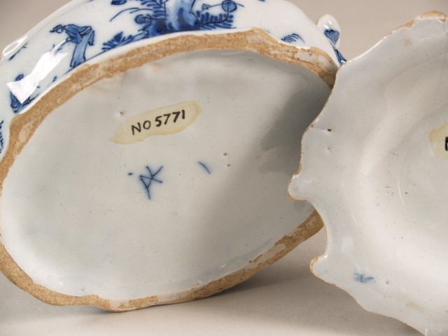 Geschulpt ovale botervloot met aan weerszijde een plat opstaand greepje, waartussen het deksel valt. Het deksel is licht...ecor.||Delft||De Grieksche A, plateelbakkerij (periode Jacob van der Kool 1722-1757)||Keramiekmuseum Princessehof QNO 05771 |