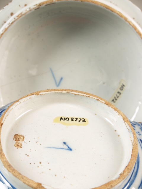 Ronde kom met dito deksel en twee c-vormige lusoren, in blauw-wit gedecoreerd met een chinoiserie decor.||Delft||onbekend||Keramiekmuseum Princessehof NO 05772 |